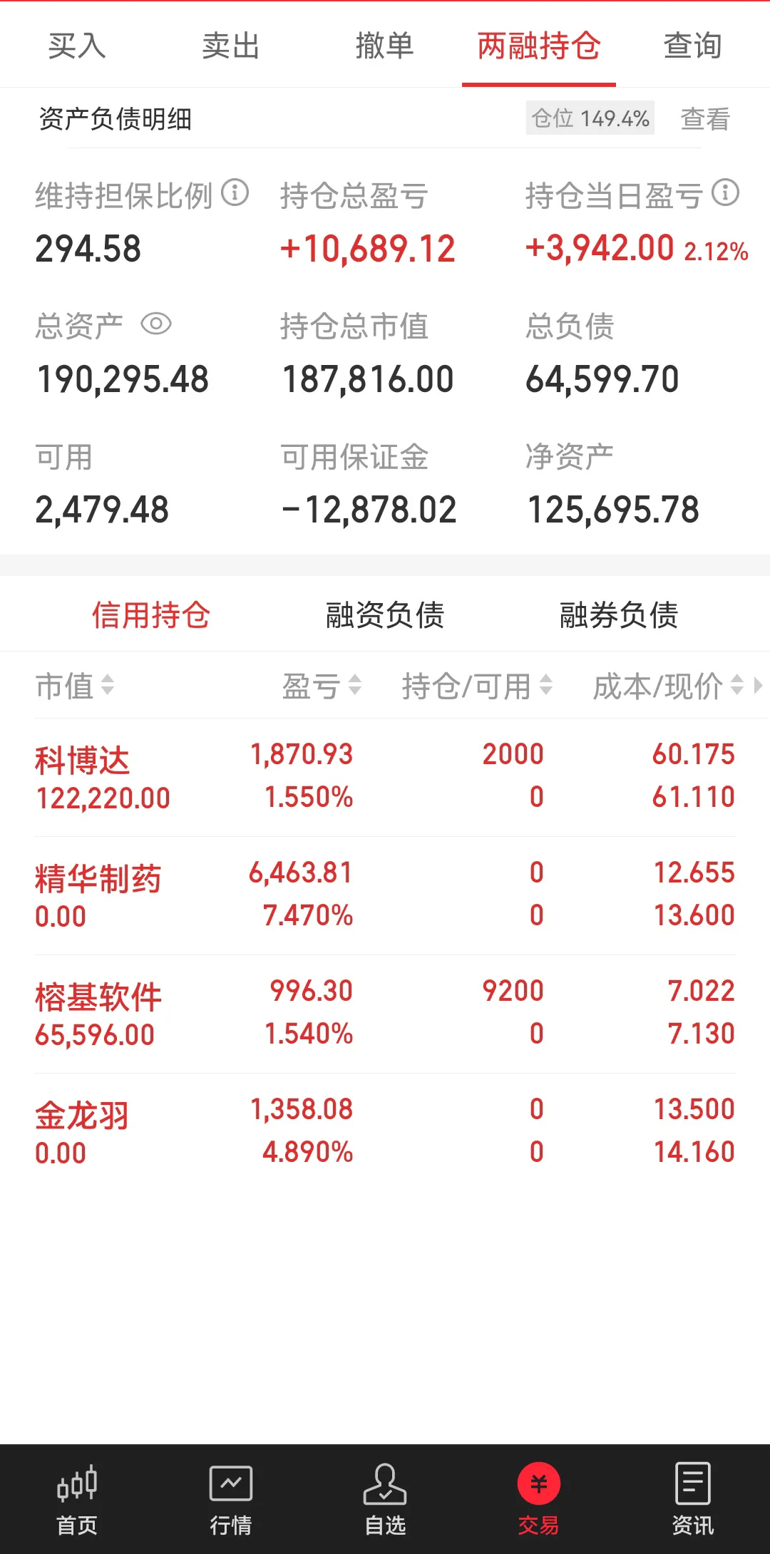 2. 信用账户,昨日融资部分买入的002349精华制药早盘小幅高开,高开上冲后抛压较大,于是在13.4左右将全部仓位卖出,自有资金部分买入的002882金龙羽今日早盘低开1%,随后小幅上冲后翻绿,果断在水下13.68全部卖出,由于股指持续上涨中,个股没有好的买点,自有资金部分满仓买入上周涨停最近几日连续下跌的三季报超预期的汽车零部件股603786科博达,融资部分买入正在调整中的软件股002474榕基软件,截止到收盘,两只持有个股小幅获利中。