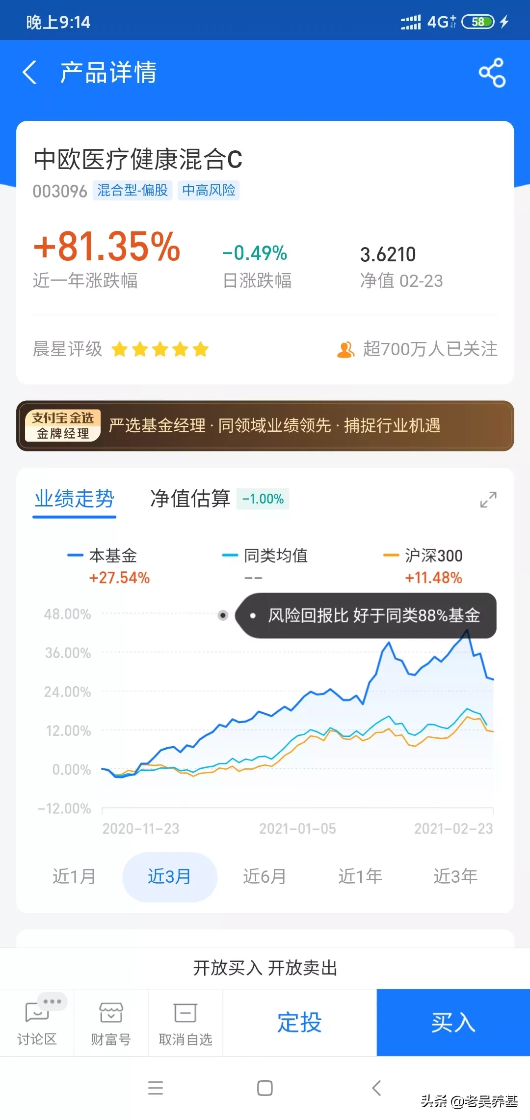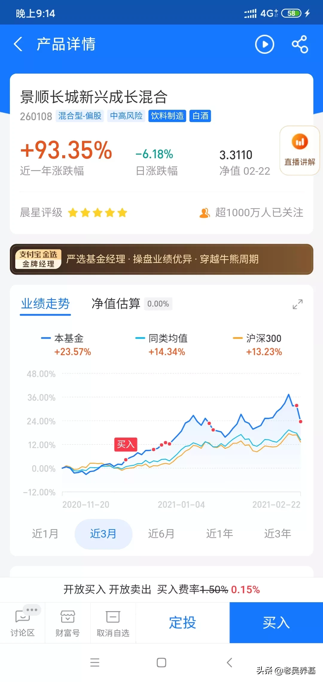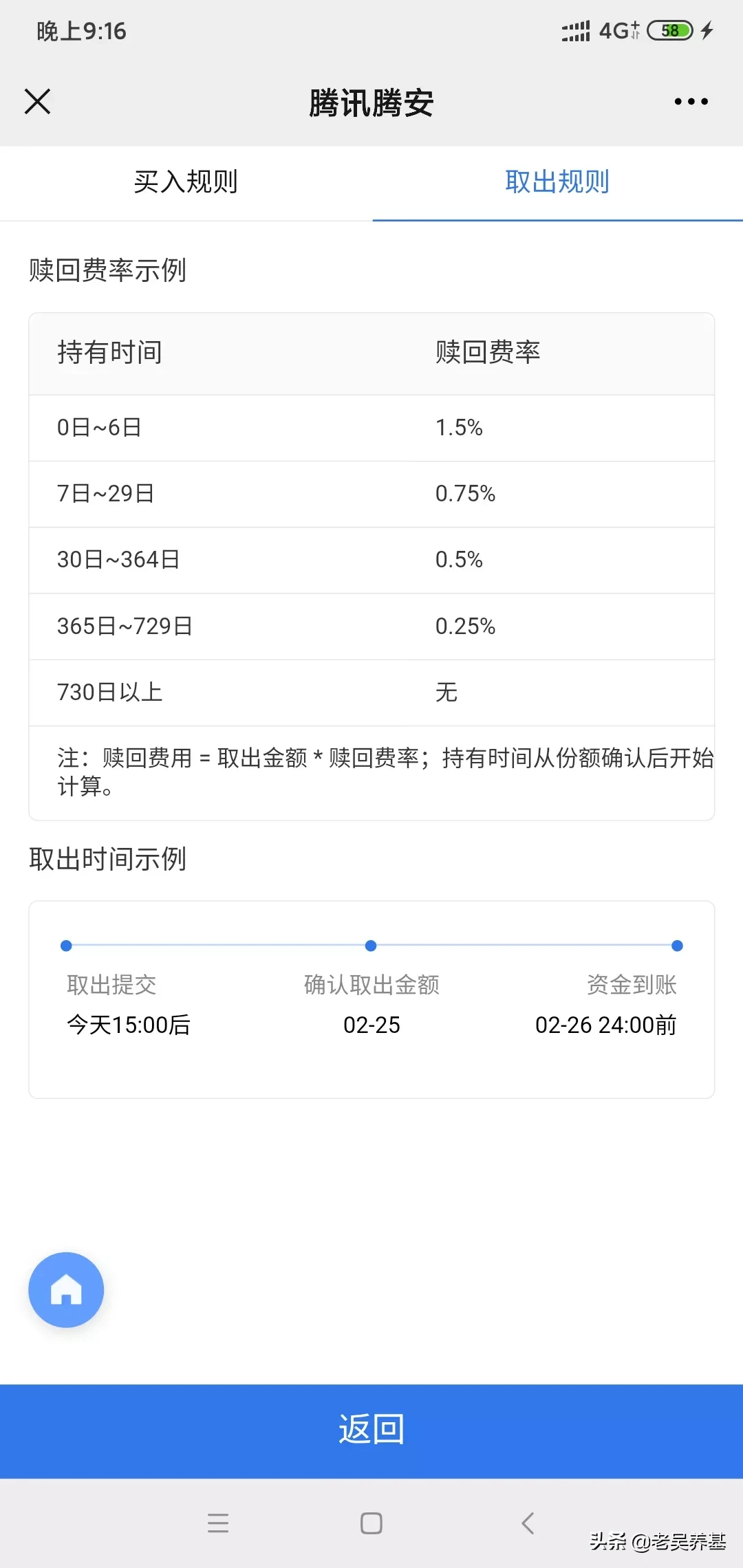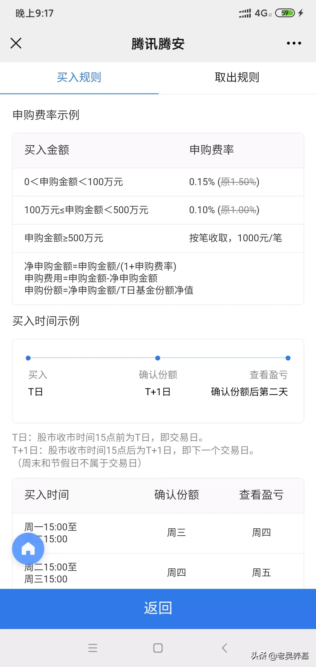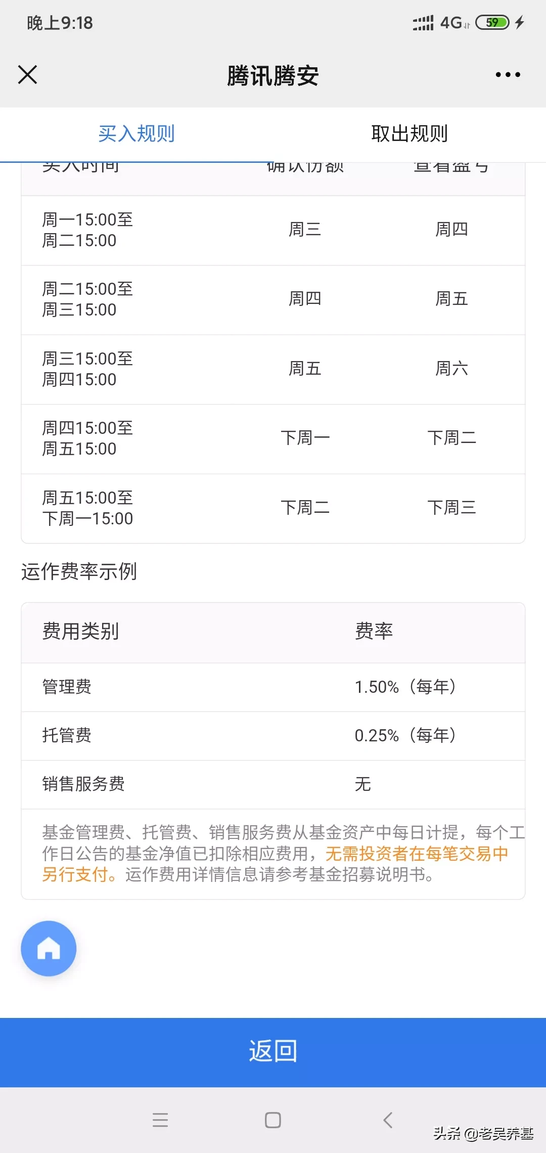 像我老婆这样的就不用买了,这一两年市场火了,在头条上老吴看到很多条友买基金竞然做成T+2的,就是今天买后天就卖,把基金当赌场赚差价!难道他们不了解或无视买卖基金的费用吗?7日内卖出要收1.5%的费用!10次卖买的费用就差不多20%了,这不是自己割自己韭菜吗?希望看到我这篇文的基友千万不要这样买卖基金。持有两年以上卖出零费用!所以老吴一直跟大家说要长期持有,也是有这原因之一。另外基金每年还有管理费和托管费。下面3张图就是一般基金的费用,不了解的可以看一下,每个基金都有说明。感谢大家关注和支持老吴,老吴平时晚上才有时间在头条上发唠叨。老吴以后会经常发一些干货,我们一起相互学习,一起成长,一起赚大钱!
