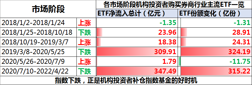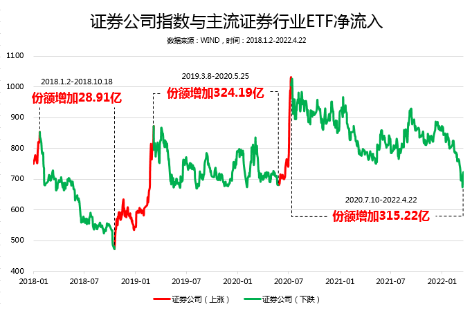 另一方面,我们可以发现,专业的投资者在投资券商板块的适合,往往是“越跌越买”。以券商ETF基金为例,当市场上涨的时候,这些ETF基金的净流入与份额增加的并不多;但是在市场下跌的时候,这些ETF基金的净流入和份额却出现了较大增长。所以大家在布局券商板块的时候或许可以参考专业投资者的“操作”。