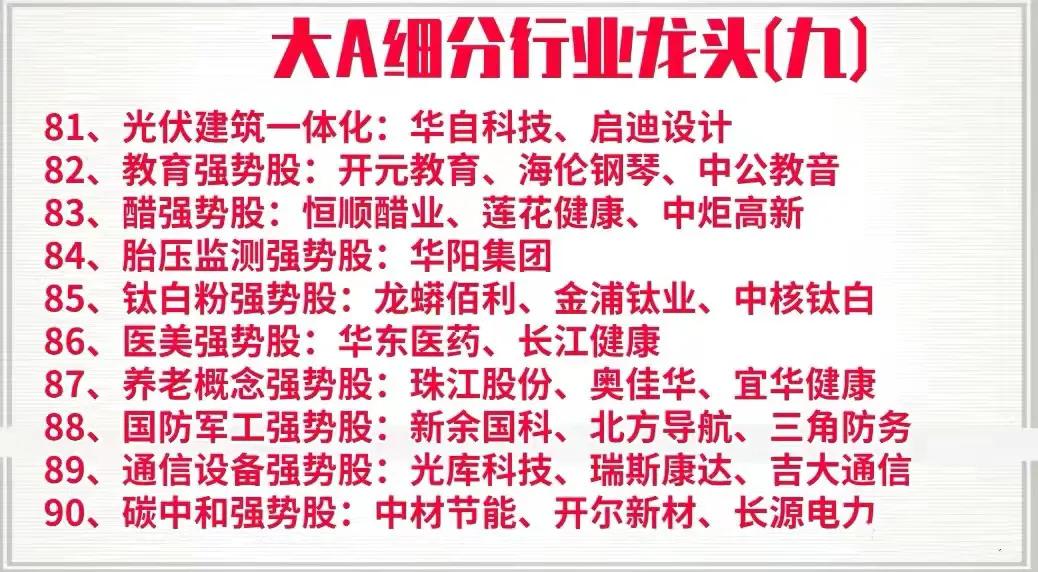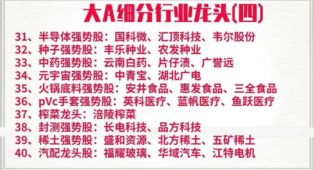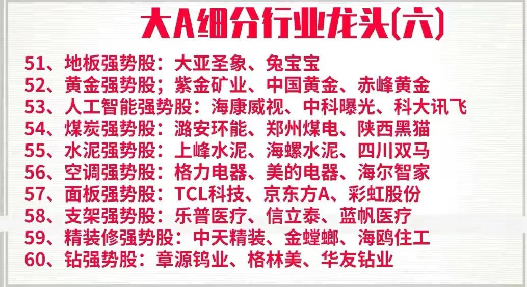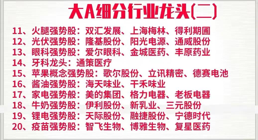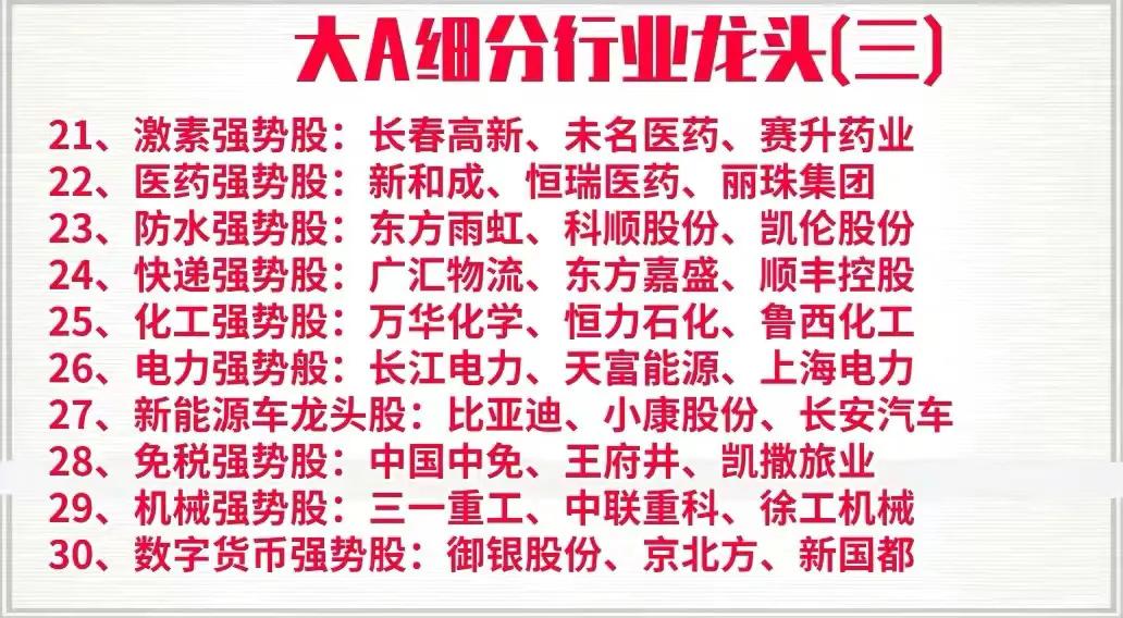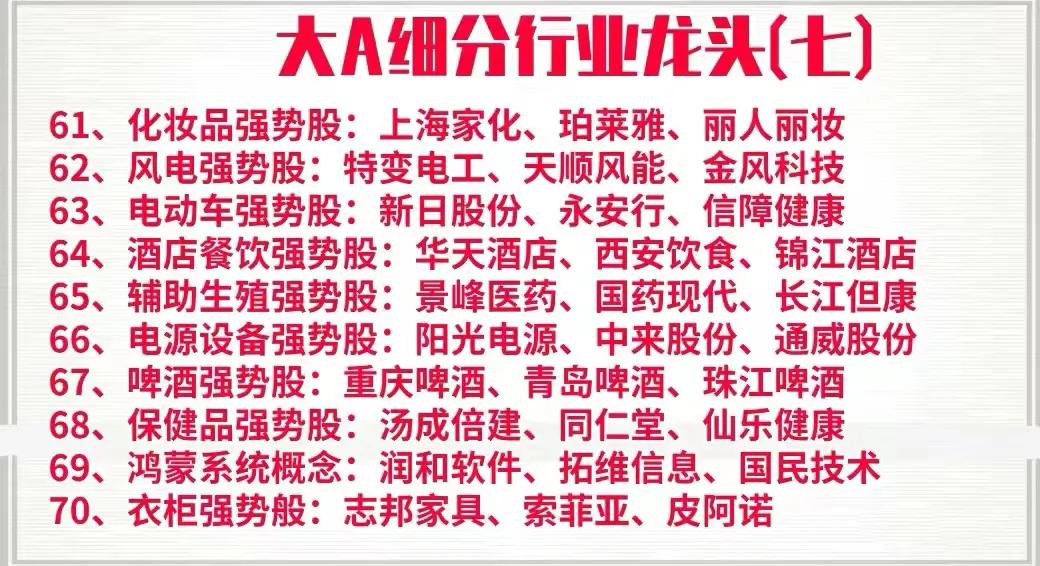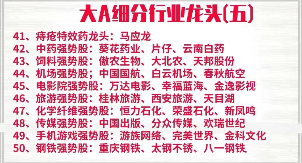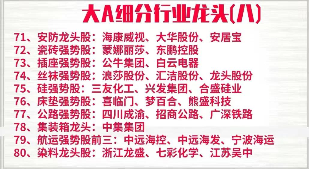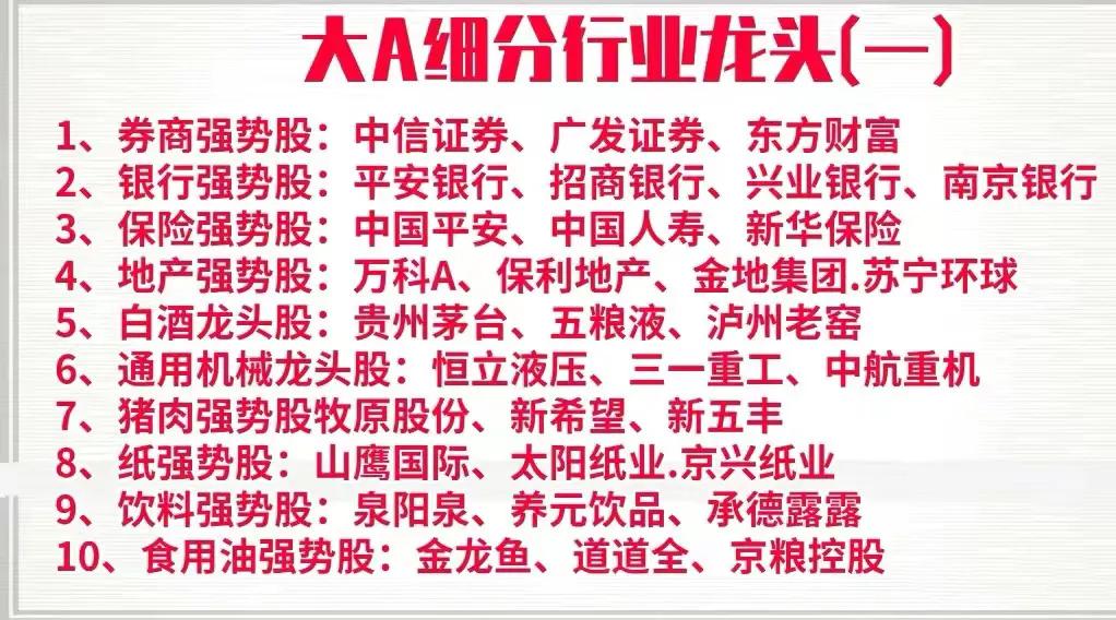 周末花了一天时间,终于把A股中各个行业中细分龙头以及强势股整理了出来,明细中的上市公司基本都是各行业的领军代表,是行业中的护城河,具备良好的发展前景,同时也是行业中的佼佼者,如果你想在下半年打一个漂亮的翻身仗,不妨收藏好这一份名单,可能账户翻翻的机会就在其中,拭目以待!