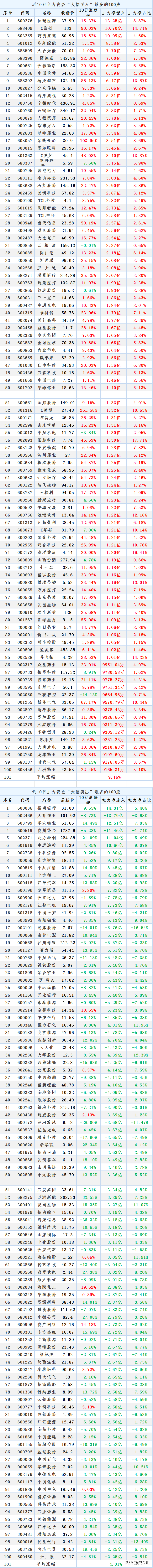 近10天主力资金“最大买入”100股及“大幅卖出”100股名单