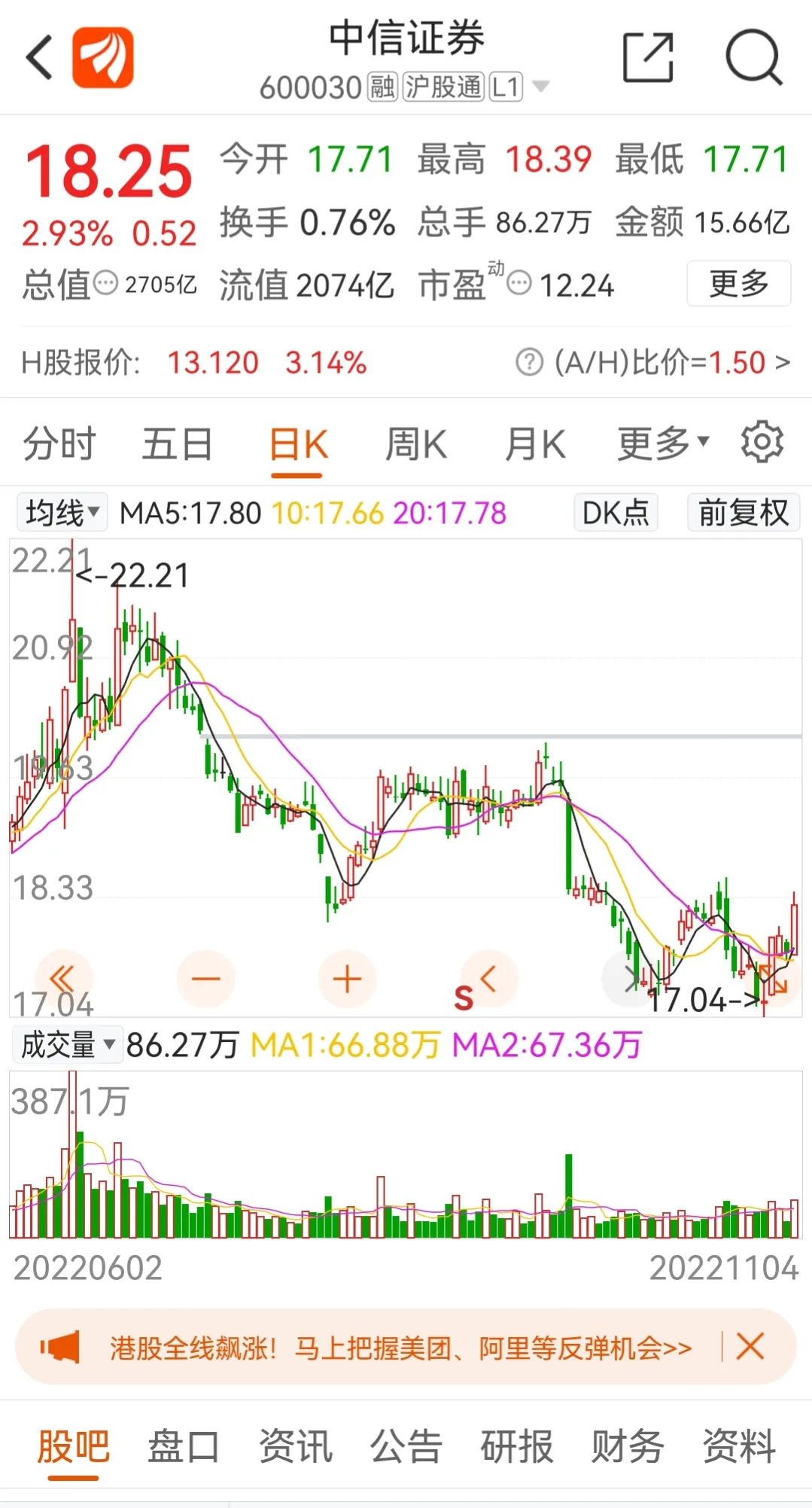 第二,能否永远告别3000点以下,观察中信证券,虽然中信的名声很臭,但行情的启动首选券商。春江水暖鸭先知,有行情了,就有成交量了,券商就来钱了。中信作的券商一哥,不可能不分一杯羹。现在看来,券商似乎在蓄势之中。