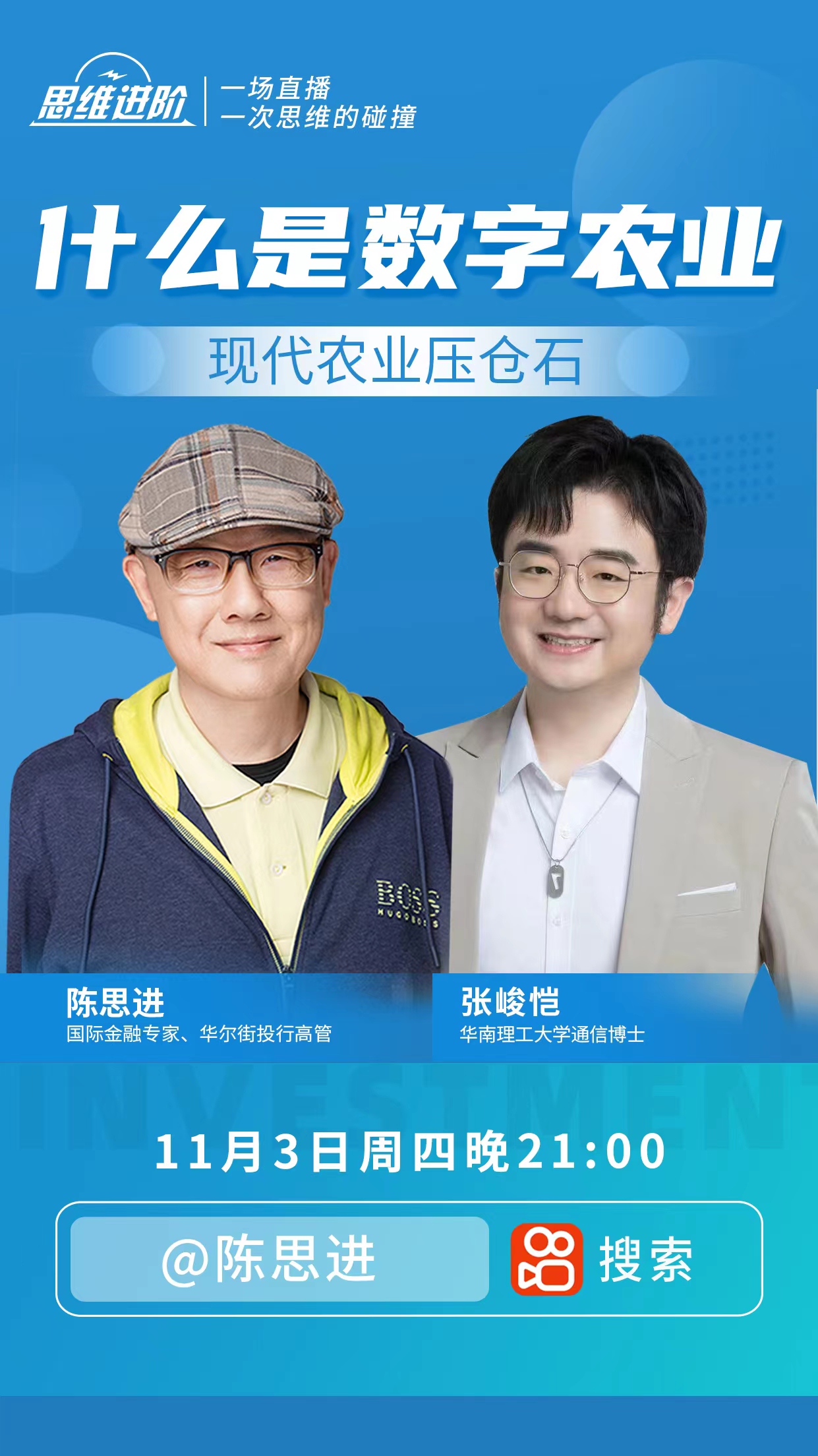Last but not least,再打个小广告,昨晚(11月03日周四)晚21 : 00,在我的快手直播间(陈思进),邀请了通信博士张峻恺,从“什么是数字农业——现代农业压舱石”切入,谈了几个相关的热点话题,干货满满,特别在最后半小时中提到,“这是我最后一次的每周四晚9点固定时间的直播,将暂停一段日子。从前年初开始在百度《超级对线》的直播( 网页链接 )、去年的911开始在快手每周至少一次的直播,都是强内容输出,前后一共有超过100场直播,每次平均2小时,将财经金融等方方面面都谈到了,可以反复收看回放,以建立具有底层逻辑的系统性思维……不过,以后依然会有不定期、不同平台的直播。” 可复制 ##X-9qtsTsV5ge01r1##,打开快手,查看直播精彩回放,谢谢关注!)