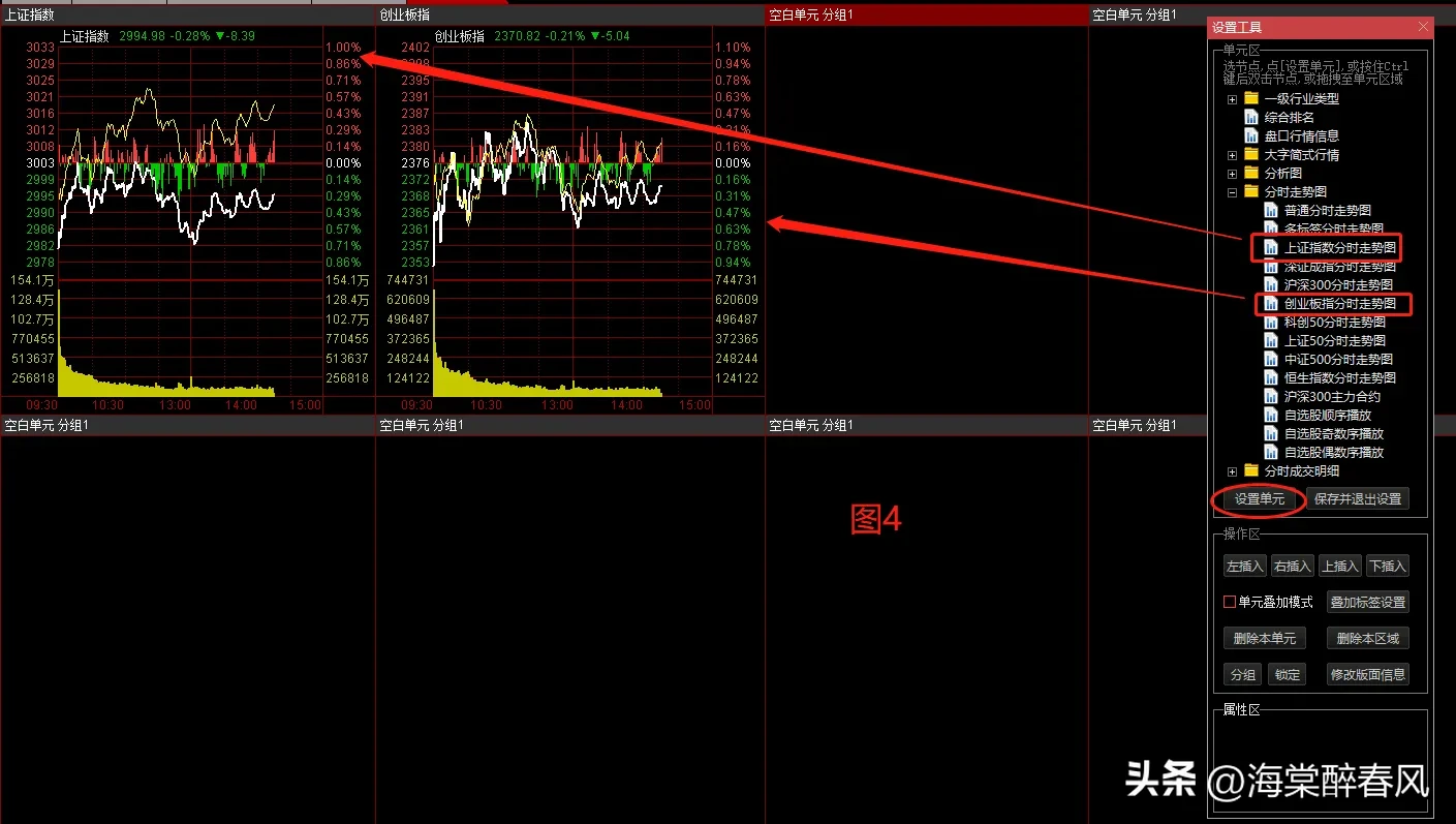 四、从右边设置工具中,找到“分时走势图”栏,依次把上证指数分时图、创业板指分时图加入左边的空白框里,这样就可以在这个版面随时看到大盘和创业板的分时图,如果需要看其他指数,也可以自由添加。(图4)