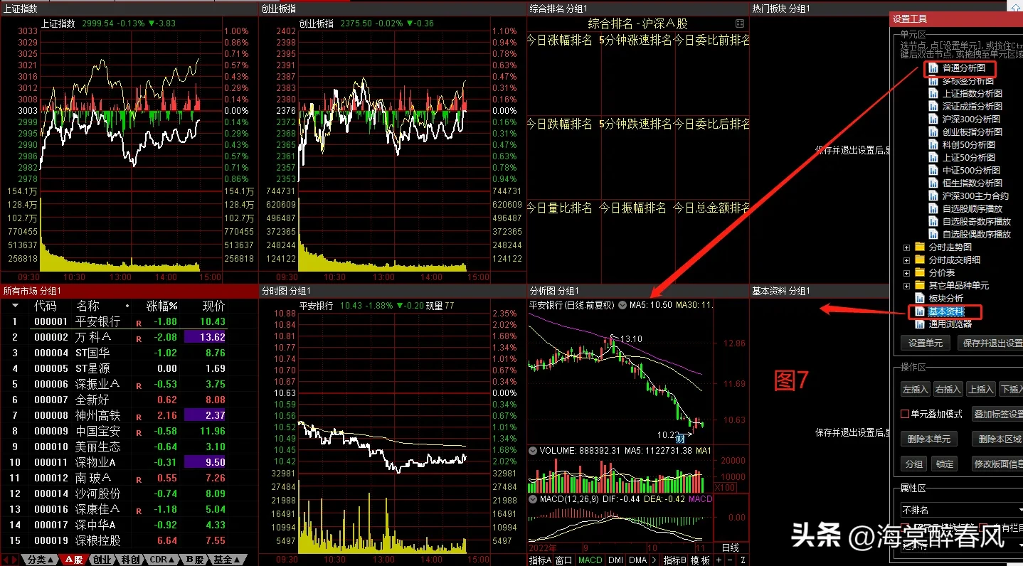 七、把普通分析图和基本资料放在最后两格,这样就可以同时看到个股的所有信息了。从分时图,到K线图,到基本资料热点题材全都有。(图7)