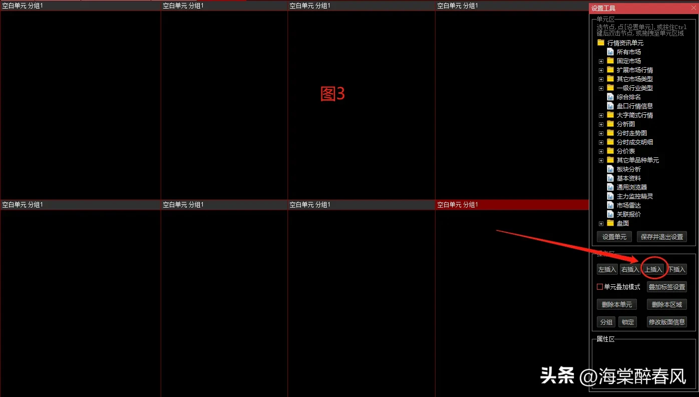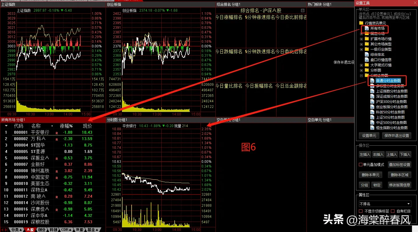 六、接下来把所有市场和普通分时图,分别放入下排的格子,这样就可以随时所有市场动态以及个股的分时图。(图6)