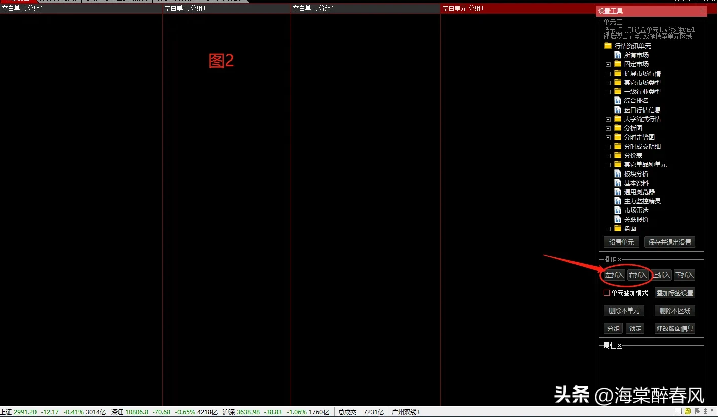 二、在版面里点击右边的设置工具,点击下方的左插入和右插入,讲版面分隔成4个模块。(图2)