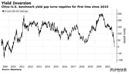 具体数据如下:2020年底,中美10年期国债收益率利差高于2.2个百分点,2021年第一季度降到2个百分点以下至当年底仍然在1个百分点以上,进入2022年迅速降至1个百分点以下,3月下旬已降至0.5个百分点以下。
