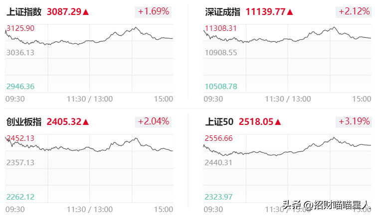 A股三大指数高开高走,午后冲高回落,截至收盘,上证指数上涨1.69%,盘中突破3117.74点,报收3087.29点,深成指强势上涨2.12%,创业板指大涨2.04%[给你小心心][给你小心心][给你小心心]