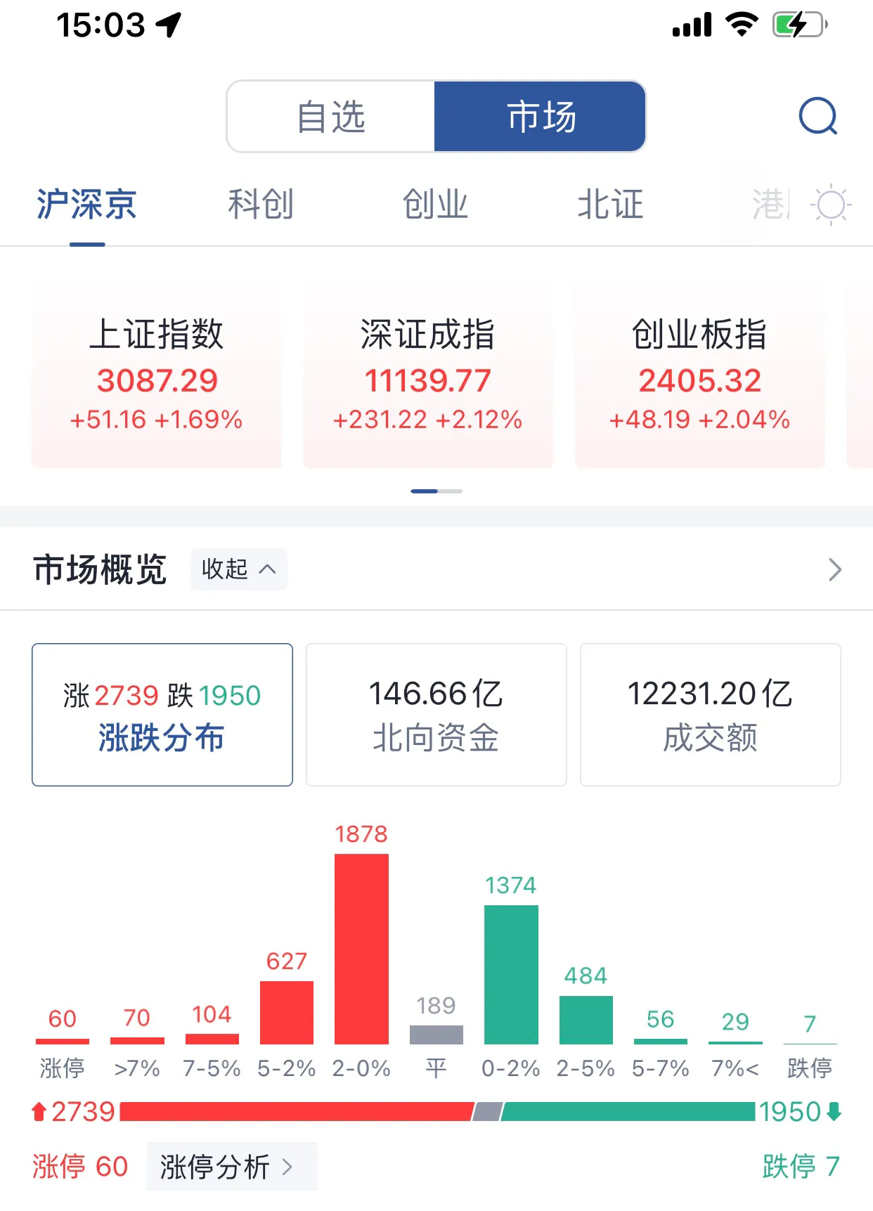 总体上个股涨多跌少,两市超2739只个股上涨,1950只下跌,沪深两市今日成交额12231亿,较上个交易日放量3803亿,成交金额创近期新高。