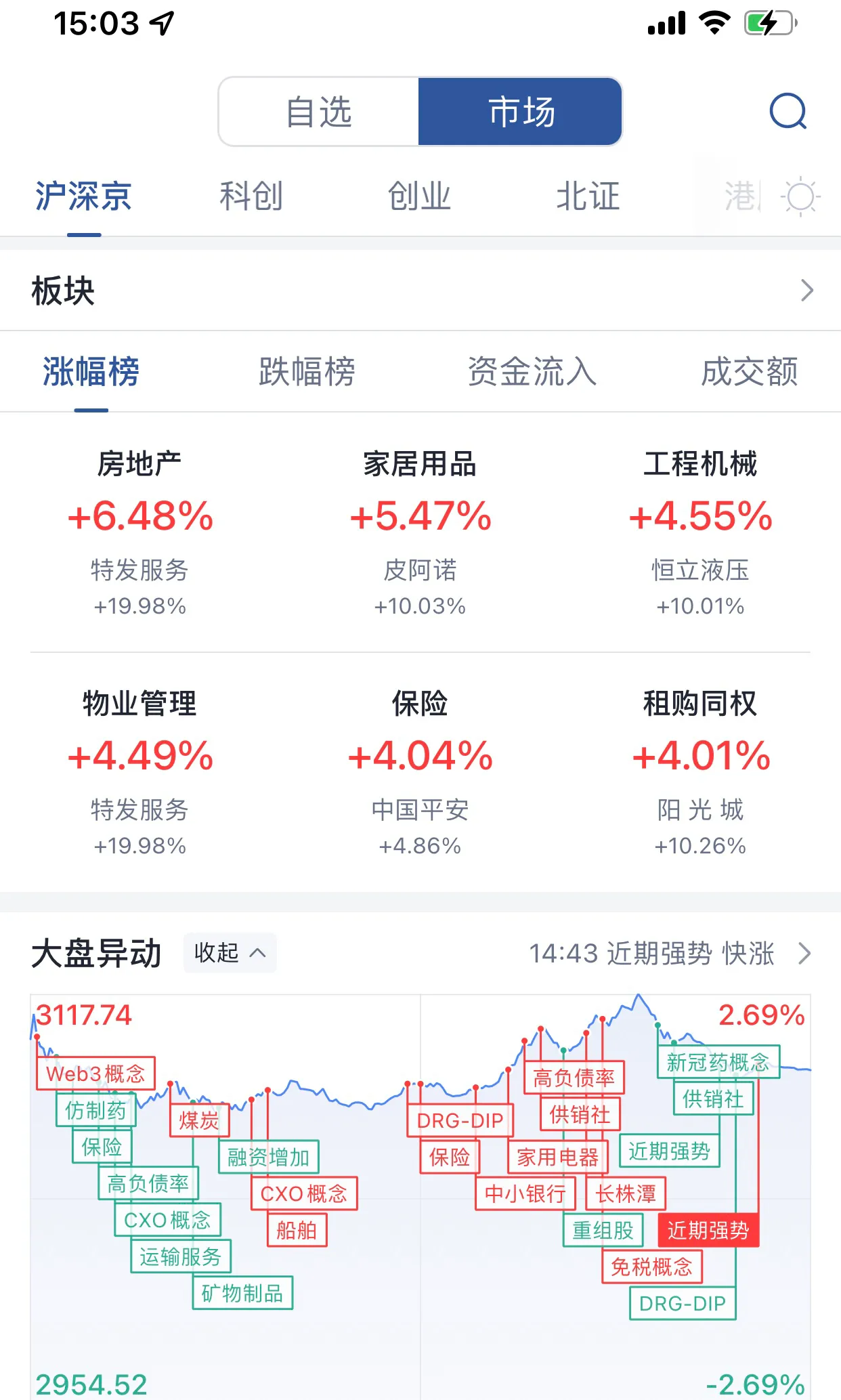 盘面上,房地产板块午后大涨,板块内个股掀涨停潮,银行、券商、白酒等权重板块反弹。