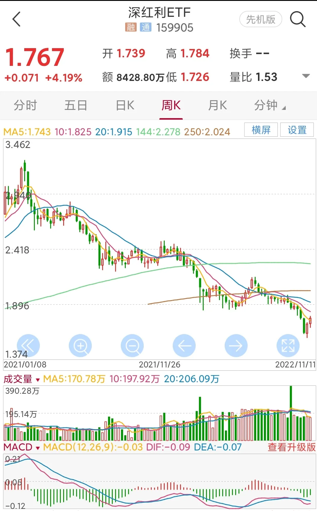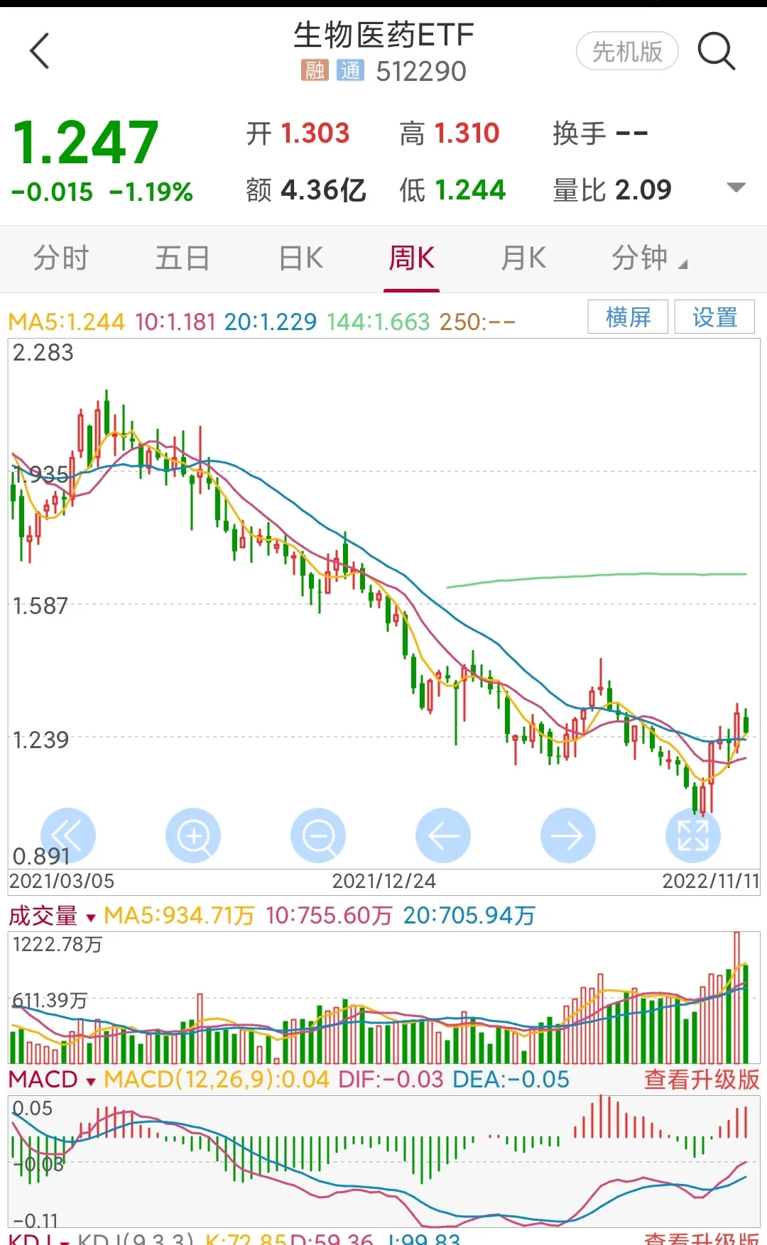 4.生物医药etf,日线周期上涨趋势初步形成,但量能过大,建仓区1.13-1.2元,止损点1.04,目标1.35元左右,涨幅8%。
