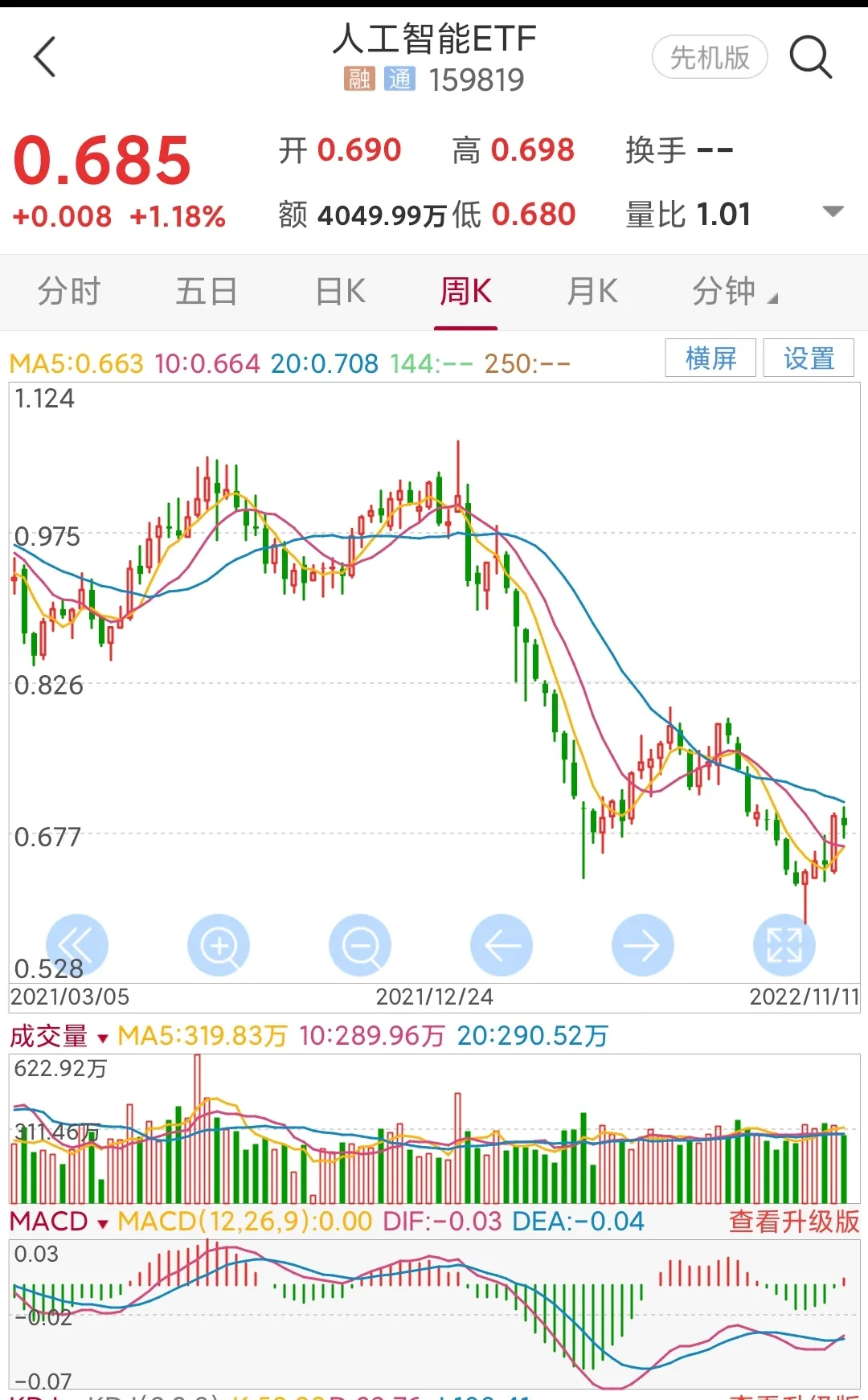 6.人工智能etf,日线周期上涨趋势未形成,放量上涨仍需减仓,建仓区0.666元左右,止损点0.64,目标0.715元左右,涨幅4%。