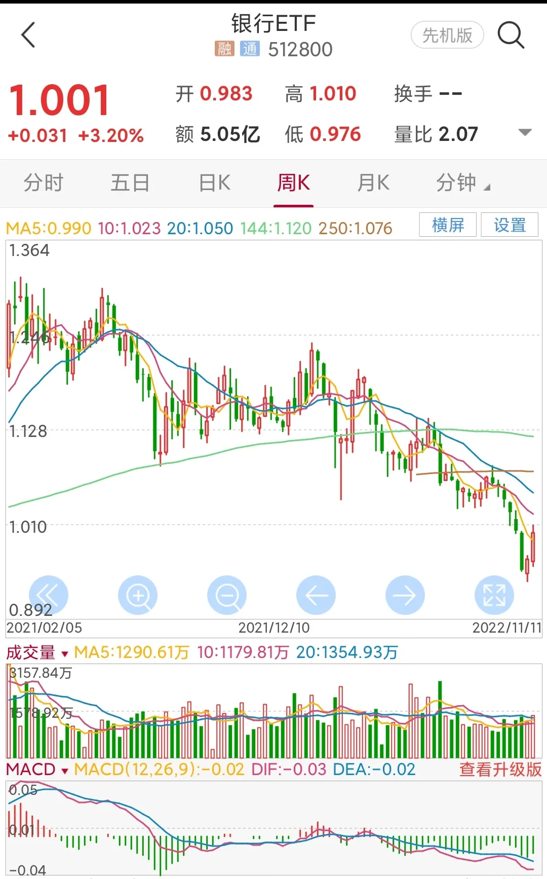 7.银行etf,日线周期上涨趋势未形成,放量上涨仍需减仓,建仓区0.98元,止损点0.96,目标1.03元左右,涨幅3%。
