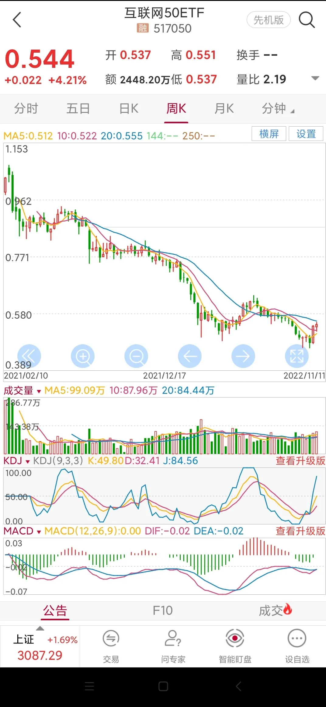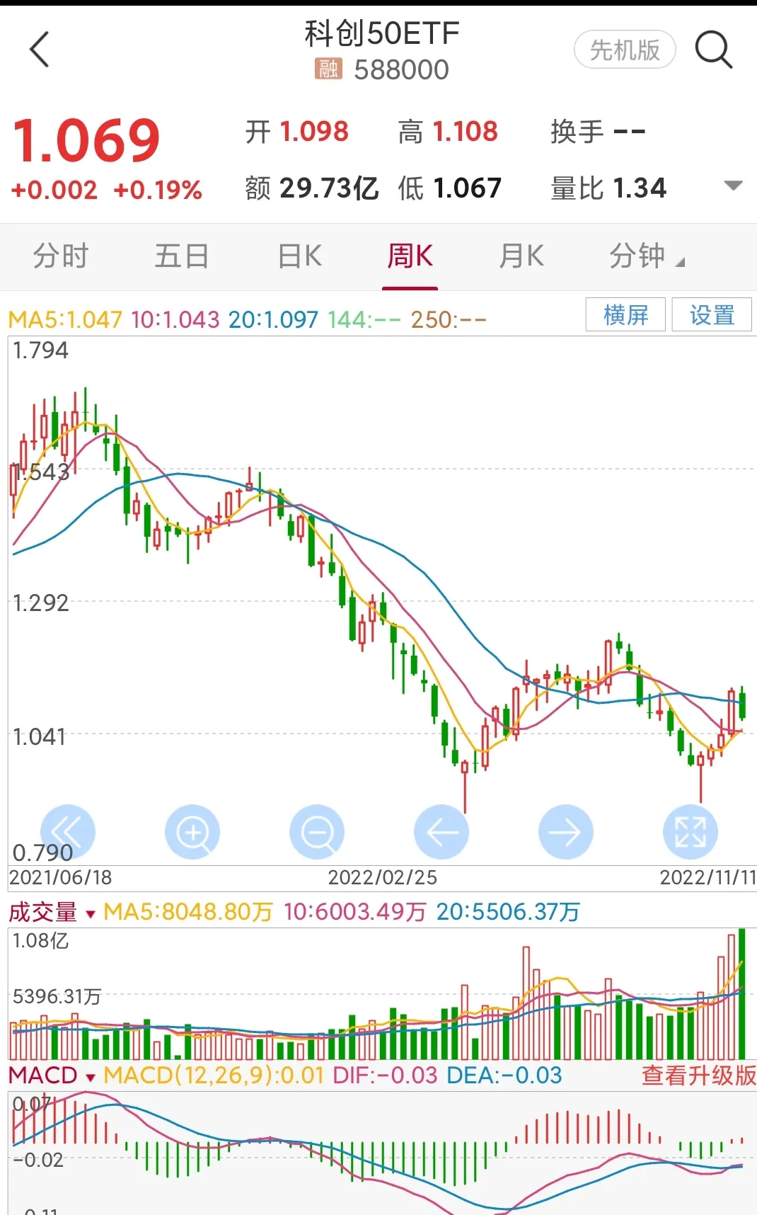 3.科创50etf,日线周期上涨趋势初步形成,建仓区1.04-1.06元,止损点1元,目标1.19元左右,涨幅11%。