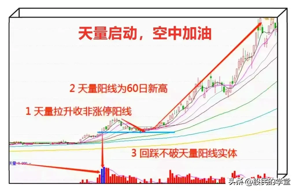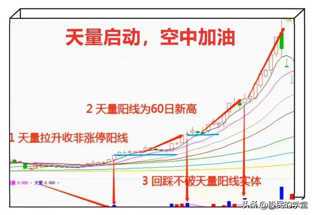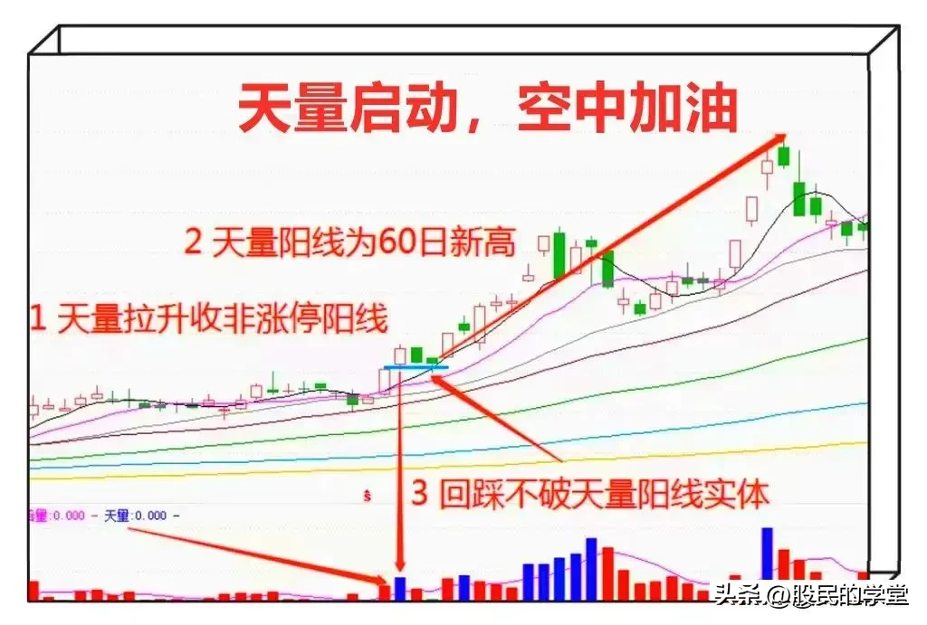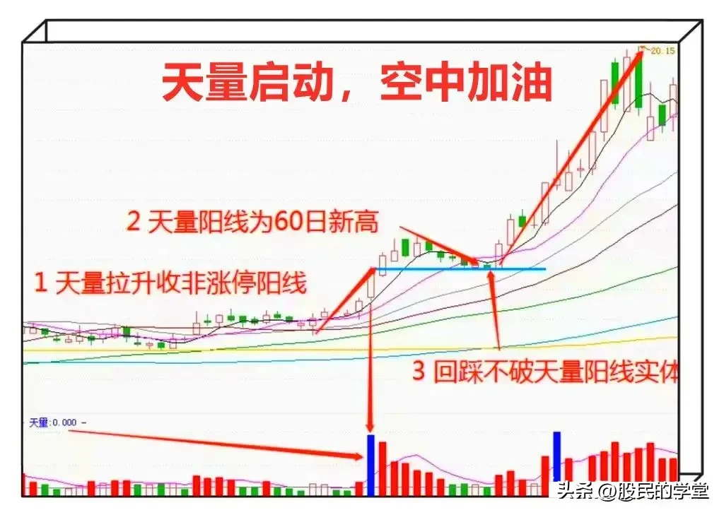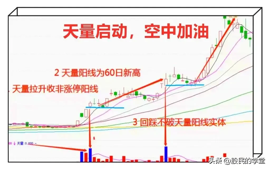 股价在低位出现天量,经过小幅拉升后,随后展开缩量类似横盘调整,短期均线和macd指标纠缠,接着再次放量上攻,这就是“天量启动,空中加油”短线形态,下面把这个战法分享给大家,建议收藏转发!