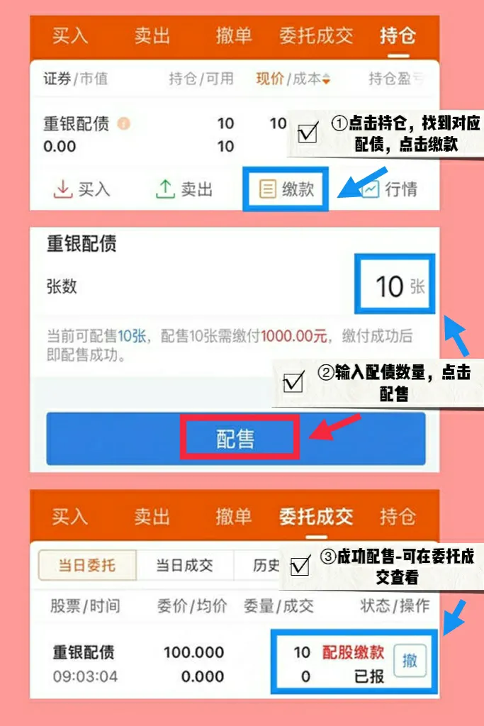 四、配债缴款:持有股票要“配债”的老板,需要在新债发行申购当天(11月16日),去到资金持仓里面找到对应的配债,然后手动点击缴款。新债中签一般是自动缴款,配债“必须在当天交易时间段内”手动缴款。