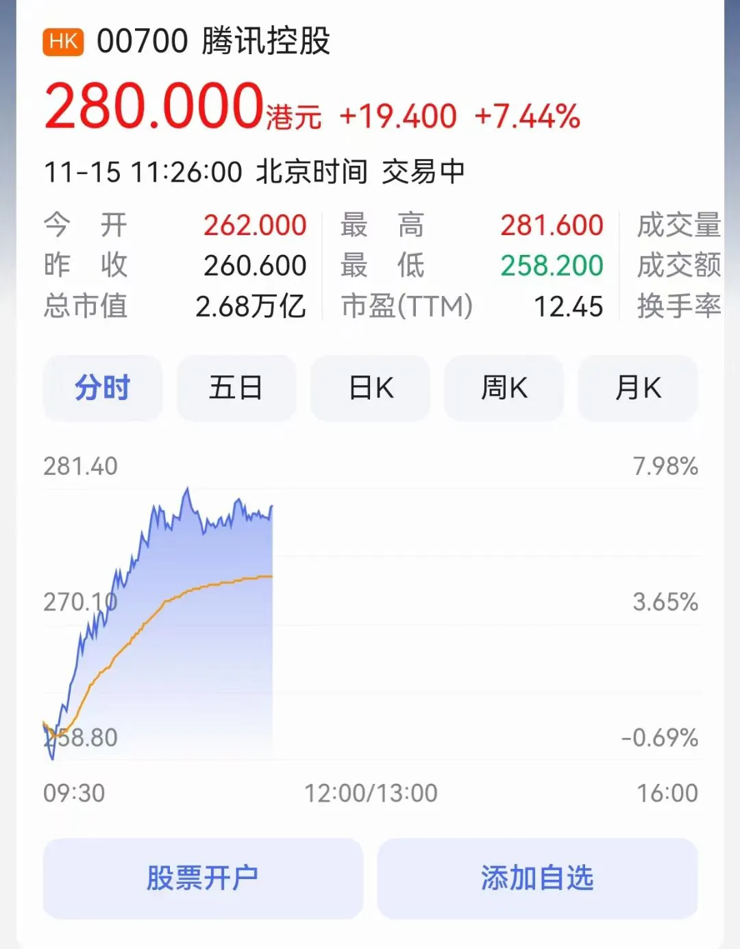 现在腾讯股票已经在一两个星期内,从200块涨到280了,涨幅40%。