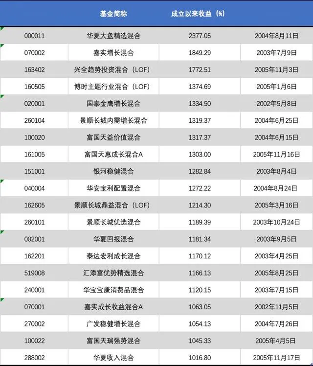 1. 排在第一位的呢是行业内的传奇基金——华夏大盘精选混合:目前收益率超过了40倍。这样的收益在大量资产中,估计只有少数一线城市的房产和大牛股才能达到。华夏大盘呢也是国内第一支净值超过十元的基金。早在2009年的时候,就已经成为了一支十倍基,很多人应该还记得他背后的基金经理,当年的公募一哥王亚伟缔造的这个神话。