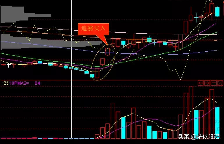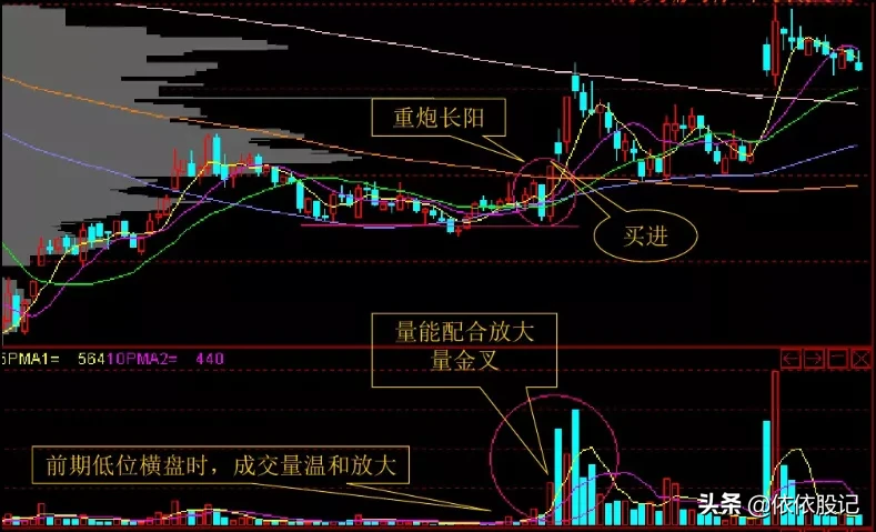 一,长阳重炮,股票在低位温和放量之后出现了一根带量长阳,这跟阳线可以是涨停阳,同时成交量为上叉阳量托,这个时候可以毫无保留的追涨