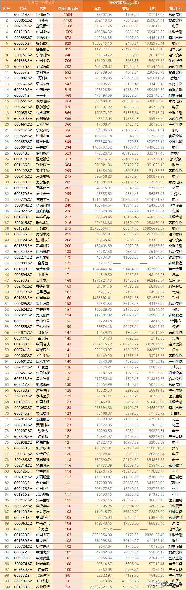 600585 海螺水泥 215 000063 中兴通讯 104