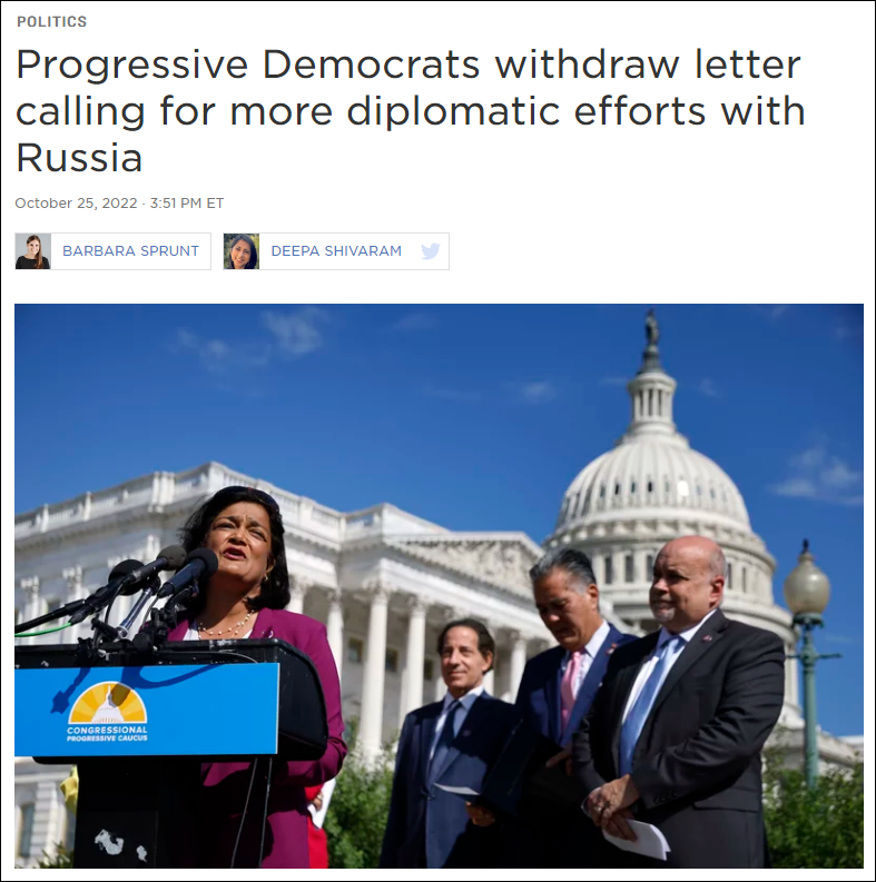 第三件事,日前30名美民主党议员联名致信拜登督促其与俄方谈判的消息曾引起关注,但仅在一天之后,也就是在25日,这些议员就撤回了联名信,原因是民主党成员的强烈反弹,称信件是几个月前起草的已不适用于当前。