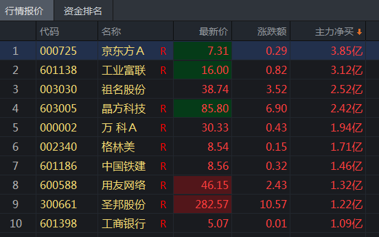 从上市公司来看,资金净流入上市公司前5名为:京东方A、工业富联、祖名股份、晶方科技、万科A。