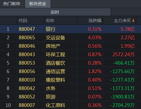 2、从板块表现看,资金净流入行业前5名为:银行、交运设备、房地产、环保工程、酒店餐饮;