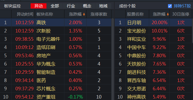 从各主线观察,高铁方向,宝光股份、日月明、祥和实业、中国中车、中鼎股份领涨。次新方向,日月明、宝丽迪、中胤时尚、福昕软件、中瓷电子领涨。电子元器件和华为概念方向,维信诺、中光学、晶方科技、东旭光电、博创科技、东睦股份、东方中科领涨。