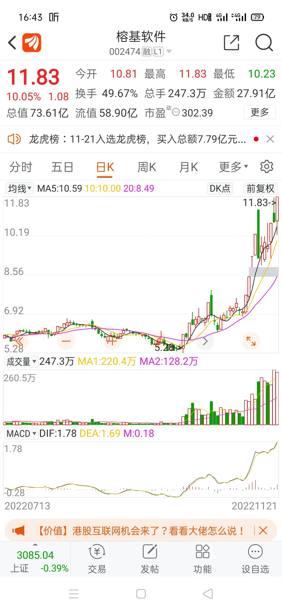 2.榕基软件,11天6板,收盘涨幅涨停+10.05%,涨停板上封单量,为62330手。数字经济概念、智慧政务。