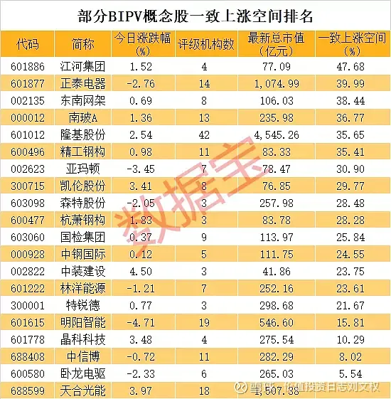 数据宝统计显示,A股市场上,BIPV概念合计有50多只个股,总市值接近1.4万亿元。从机构关注度来看,隆基股份、明阳智能、天合光能、正泰电器、南玻A等个股均有10家以上机构评级。