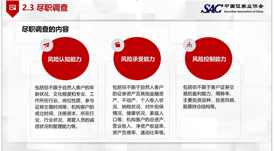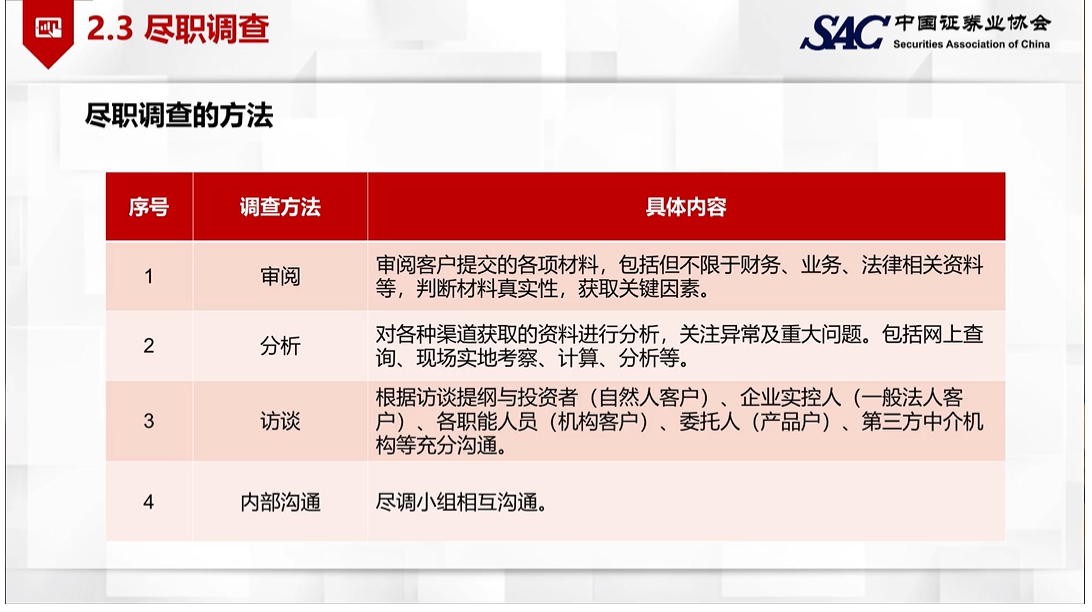 C.访谈:根据访谈提纲与投资者(自然人客户)、企业实控人(一般法人客户)、各职能人员(机构客户)、委托人(产品户)、第三方中介机构等充分沟通。