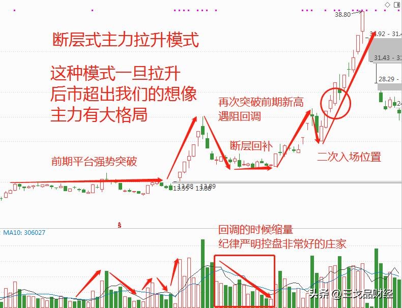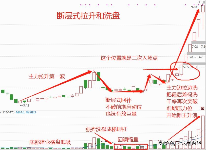 断层式洗盘庄家非常凶悍,后市拉升的高度也会非常大,这种庄家喜欢吃独食,必须把其它跟风盘以及小庄洗出来。他们会利用前期底部收集到的筹码,强势打压股价,给人的感觉好像这支股票不行了,其实是庄家迂回战术。洗得差不多的时候成交量成梯量萎缩,这个时候我们就要准备进场了。