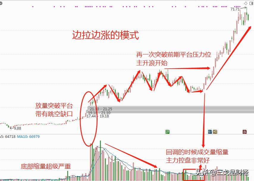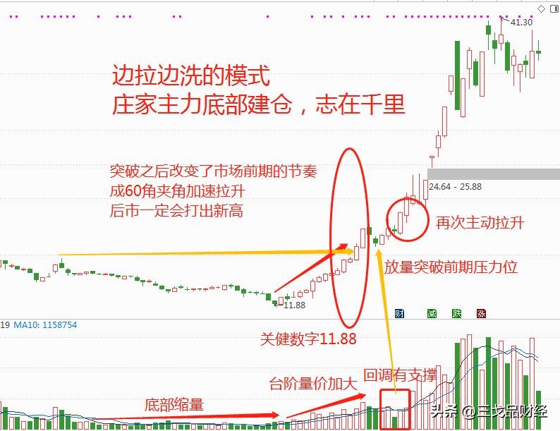 我们经常看到一支股票拉升一波之后,就开始回调,然后调整一段时间又开始上涨。其实在这个过程当中,庄家已经收集了10-20%的筹码,庄家会采用这种边拉边打压的方式,让散户首尾不兼顾,同时把获利盘、意念盘、套牢盘清洗出去,其目的是为后面的真正主升浪做准备,防止后面有人砸盘。
