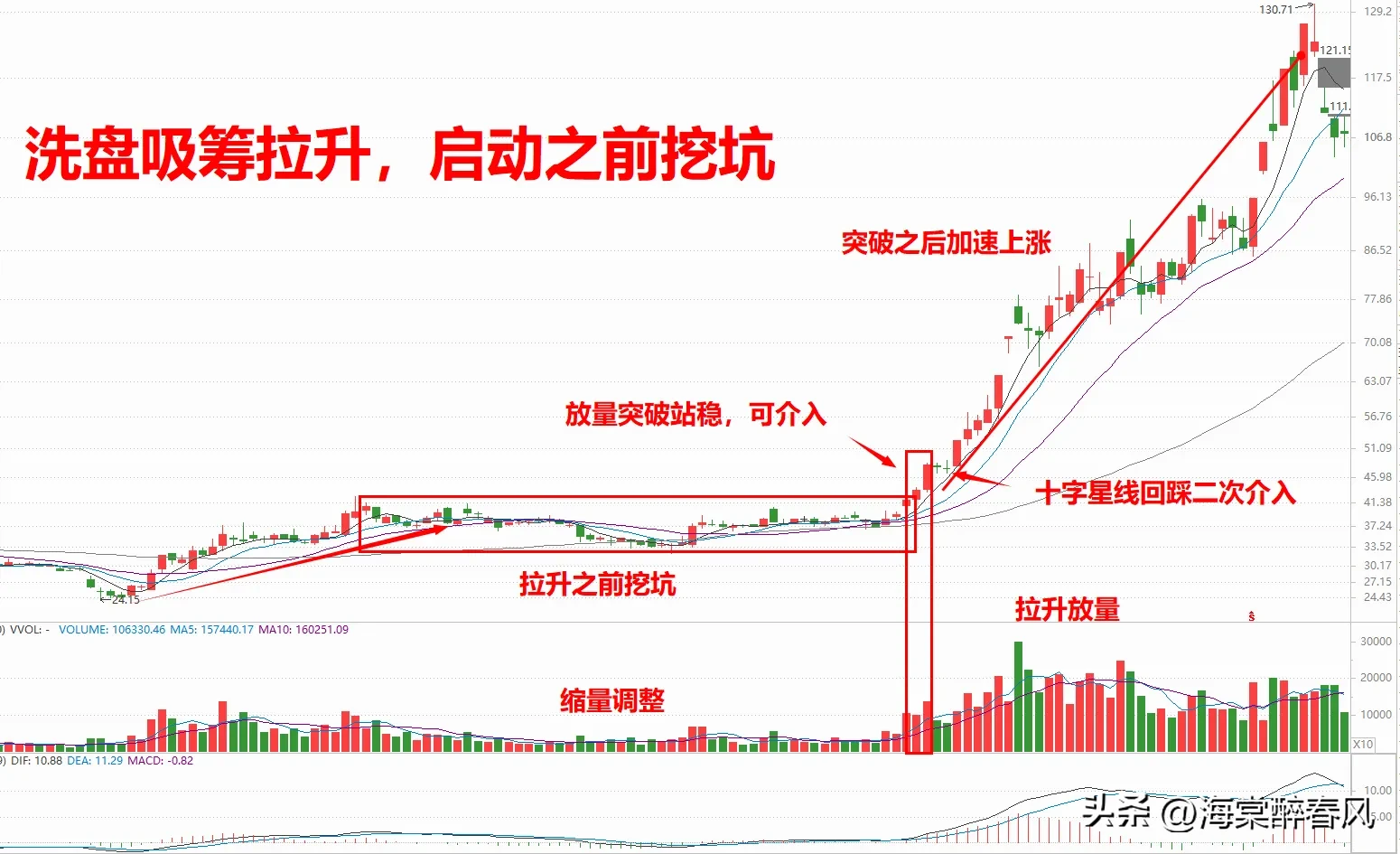 第一种,上升趋势中,边拉升边洗盘吸筹。