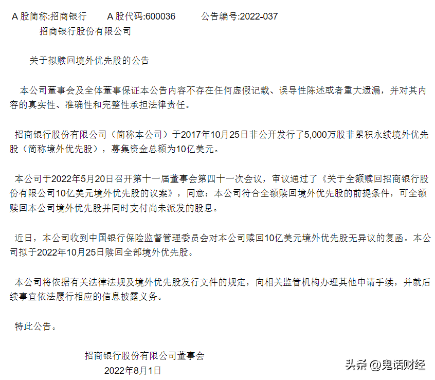 把这个搞清楚了,就懂得这个意思了。招商银行以前通过发行优先股募集了资金,现在不需要这笔资金了,就提前赎回。但是我们都知道银行现在很多都在通过各种渠道募集资金来保证满足监管要求,为什么招商银行却反过来赎回呢?原因其实也很简单,手上的钱相比需要用的多出来了,没有必要再支付这一笔利息,于是提前赎回。为什么钱会多出来了?要么就是以前赚太多了,要么就是以后可能不再需要这么多。第一种情况,谁会嫌自己钱多了呢?拿到更多的本金,会更加多放贷出去赚钱,所以这个可能性不大。第二种情况,为什么以后不再需要这么多钱?可能今后没有现在这么激进,适当收缩,也就是增长不会和以前一样快了。