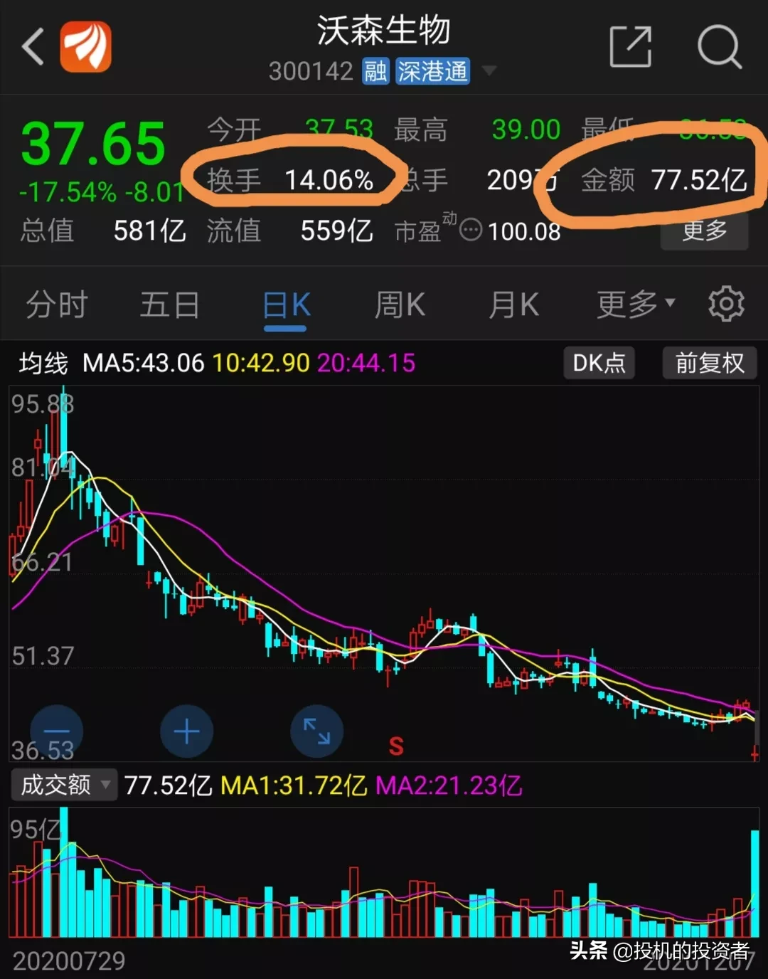 沃森早上换手率达到14%,成交金额77.52亿元。这个成交量非常惊人,肯定是有资金抄底了。