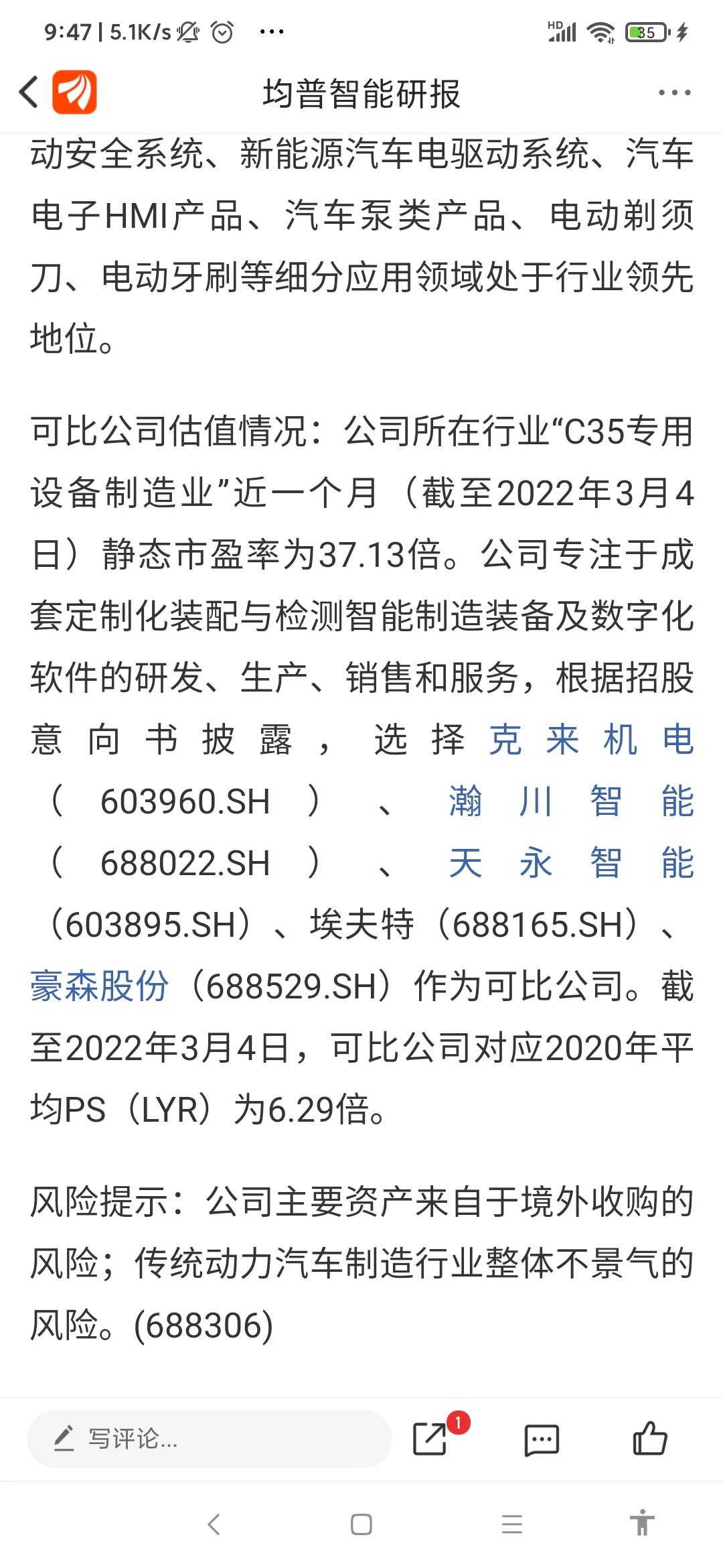 688306#均普智能# 申购代码787306,募资15.6亿,pe108,显著高于同行。有一定风险,募资不算多。1家券商研报推荐