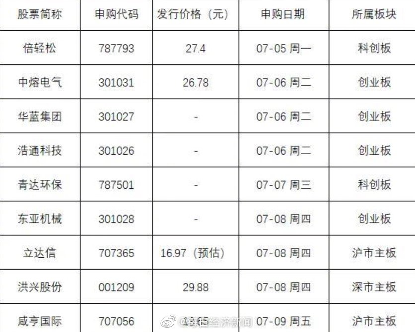 #肖战代言按摩器公司将发行上市##洪兴股份发行价近30元#【新股9箭齐发!肖战代言的按摩器股来了,还有这只睡衣股,发行价超25元…】未来一周,又有9只新股安排发行,同时已经完成发行即将上市的另外还有3只,其中不乏肉签股。9只新股当中,4只创业板、2只科创板、2只沪市主板以及1只深市主板,目前已经确定发行的4只新股有3只高于25元,中签金额和收益值得期待。而未来一周已安排上市的3只新股,7月6日上市的德才股份为沪市主板新股,发行价为31.56元,一签(1000股)金额为3.156万元,上市或盈利不少;而7月5日上市的航空股航宇科技和药房股漱玉平民,发行价都不高,可能上市涨幅大。