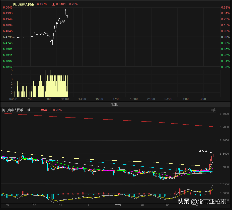 美元指数到是冲击了101点位,虽然这两天有所回落,但上涨的趋势已经确立,直接也使得人民币离岸汇率持续贬值,今天最低冲击了6.5 。在市场的表现近期就是股、债、汇的三跌格局。