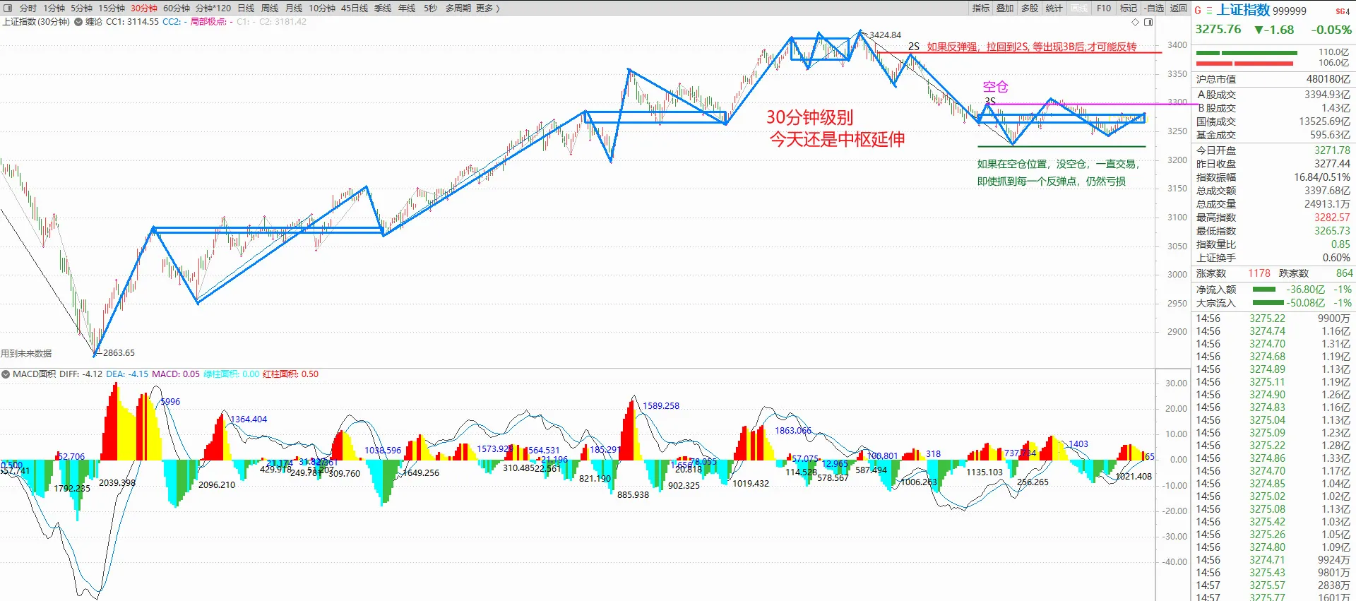 今天一直在做中枢延伸,中枢内小幅震荡。