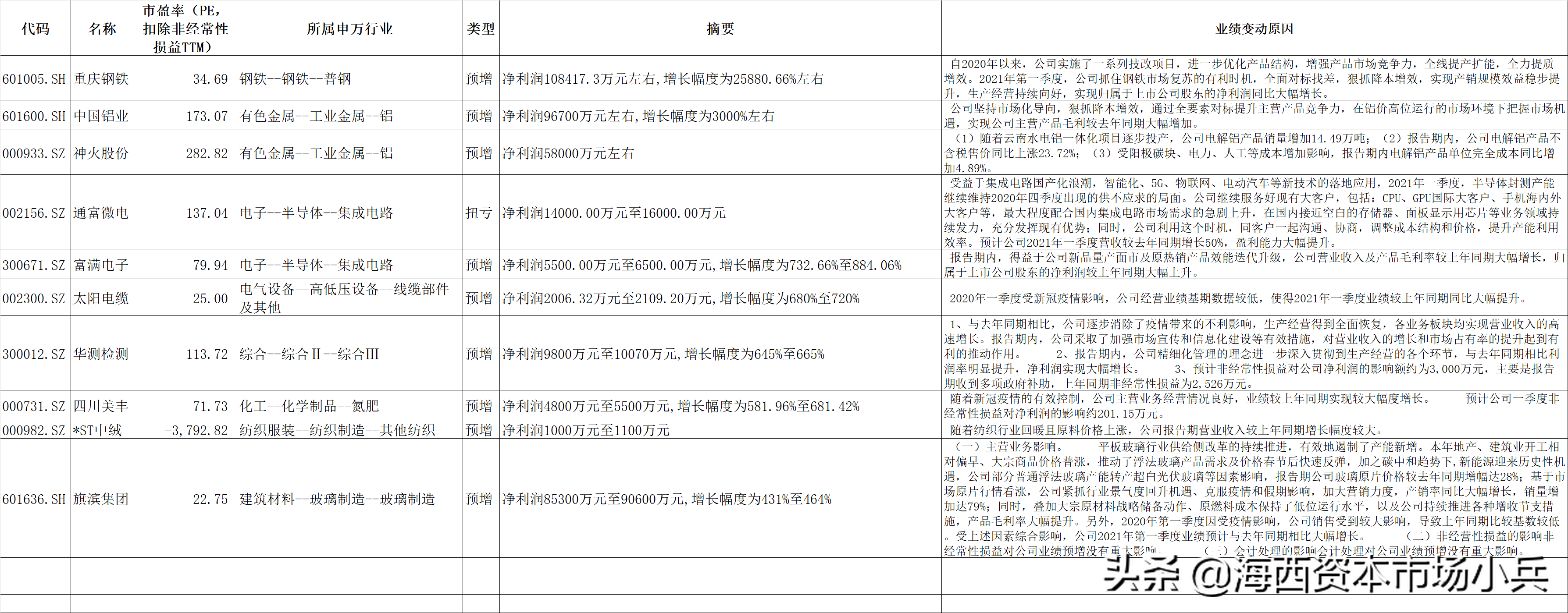 顺周期(亮眼啊):重庆钢铁(钢):净利润108417.3万元左右,增长幅度为25880.66%左右;中国铝业(铝):净利润96700万元左右,增长幅度为3000%左右;神火股份(铝):净利润58000万元左右,增长幅度1453.0778% ;江西铜业(铜):净利润83100万元至87900万元,增长幅度为419%至449%;旗滨集团(玻璃):净利润85300万元至90600万元,增长幅度为431%至464%。