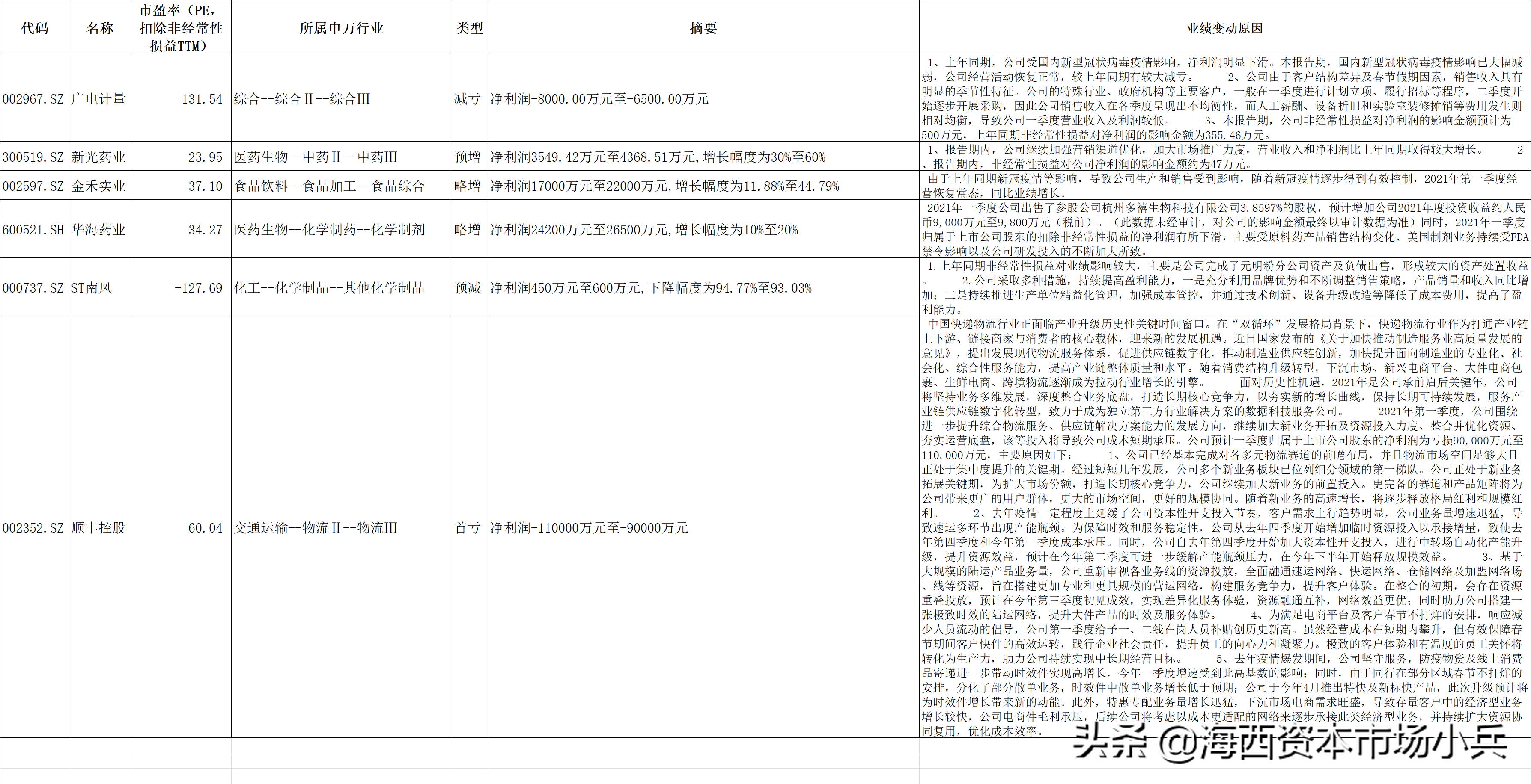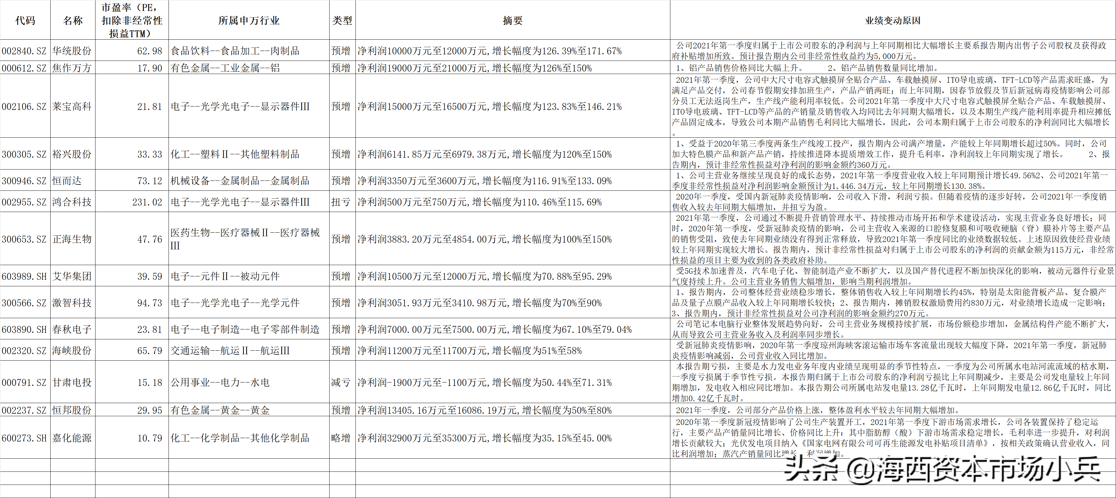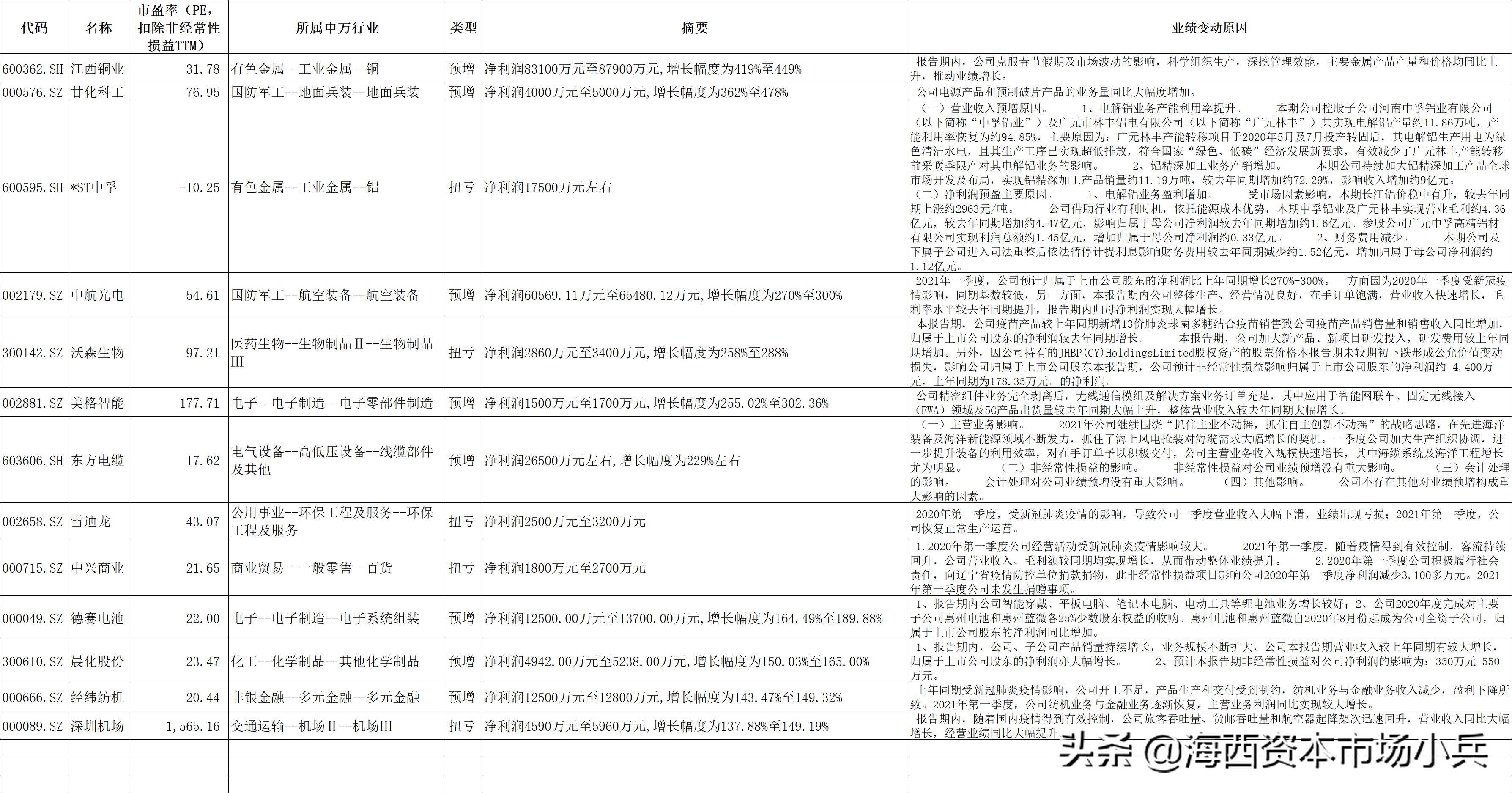 2021年4月8日,今天晚间上市公司公布的一季报业绩家数总的43家,主要还是那些顺周期股票,原因都是主要就是产品涨价,导致业绩大涨。选取一些有代表性的分析下,其他见附表: