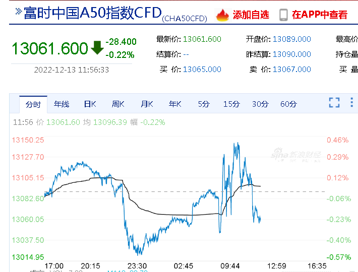 截至11点57分,富时中国A50指数CFD小跌0.24%,看下图。