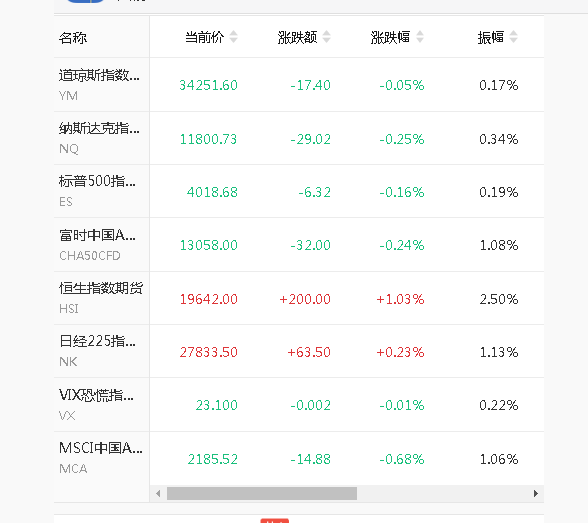 美国股指期货小跌,其中纳斯达克指数小跌0.25%,道琼斯指数小跌0.05%,如下图。