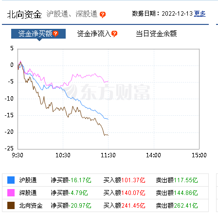今天上午,北上资金净流出20.97亿元,沪股通净流出16.17亿元,深股通净流出4.79亿元。如下图。