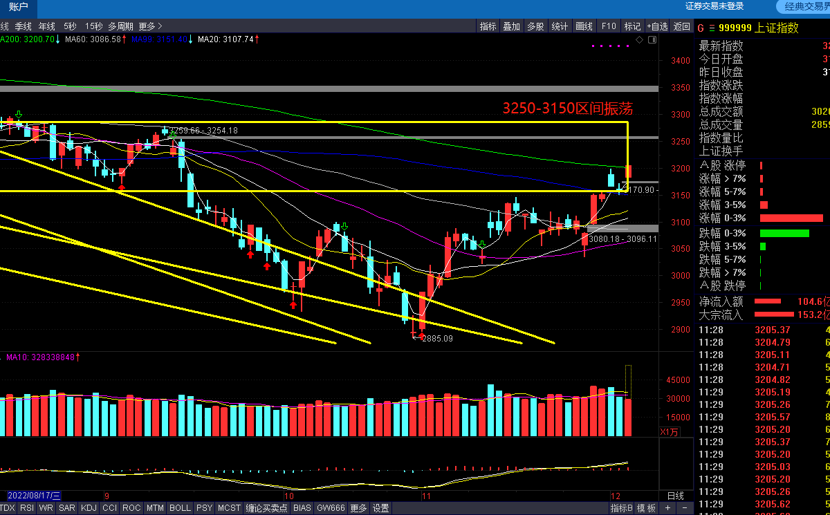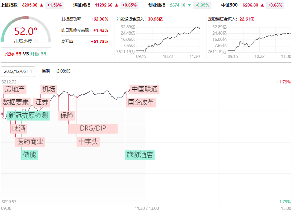 【午评】三大指数早盘高开后走势分化,两市个股涨跌各半、二八分化加剧。沪指震荡走高重回3200点上方,创业板指震荡回落,上证50指数涨超2%。盘面上,中字头为代表的国企改革概念股掀涨停潮,国企改革股的大涨也带动保险、券商、深圳国资等多个蓝筹板块走强。机场航空股展开反弹。啤酒股表现活跃。下跌方面,抗原检测概念股走弱。光伏储能等赛道股陷入调整。总体上个股涨多跌少,两市超2700只个股上涨。沪深两市半日成交额达6684亿,较上个交易日上午放量1221亿。板块方面,保险、机场、深圳国企改革、中字头等板块涨幅居前,抗原检测、TOPCON电池、医疗器械、复合集流体等板块跌幅居前。技术上看,这波领涨的上证50继续往上冲击阻力,沪指也跟随延续波段反弹,沪指早盘高开继3080点后再次形成3170点缺口,目前要把上周五形成的分时顶部结构消除需要指数保持早盘的加速形态,而创业板指数则绿盘,说明目前不是普涨行情,指数和板块的大幅分化会加大个股的操作难度,总体可均衡配置,滞胀股可持股等轮动,热点板块只适合低吸而不不追。截至上午收盘,沪指涨1.56%,深成指涨0.65%,创业板指跌0.39%。北向资金方面,沪股通早盘净流入30.96亿,深股通早盘净流入22.61亿。