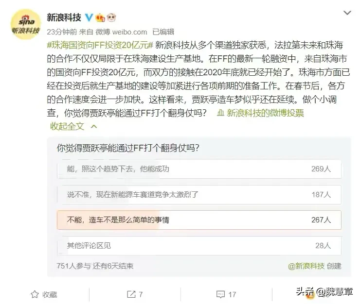 这一次,贾跃亭翻身有望?据新浪科技报道,珠海国资计划投资贾跃亭的法拉第未来20亿人民币。从网络上目前的各种信源来看,这次投资是大概率事件。再联想昨天李书福旗下的吉利要投资FF3000万到4000万美金的新闻,看来并非空穴来风。众所周知的原因,贾跃亭因为生态战略的失败,很长时间以来一直背负老赖的名声。也有很多网友对贾跃亭造车嗤之以鼻,认为充其量也就是PPT造车,但是从不这么看。恒大许家印能投资贾跃亭就足以说明问题。熟悉恒大的人都知道,许家印是一个非常有实力、有干劲、有魄力的企业家。恒大地产、恒大足球是他的两张靓丽名片。许家印能投资法拉第未来,一定是看中了它的创新能力和技术研发能力,否则不会轻易下注。虽然后来由于争夺控制权的原因,许家印暂时退出FF。但这也从侧面反映出FF具备一定的行业前瞻性和技术独特性。