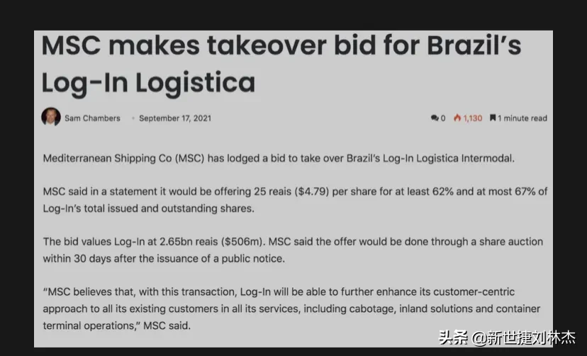地中海航运MSC正在要约收购巴西综合物流解决方案提供商Log-In Logistica Intermodal,收购估值约5.06亿美元,并已提交相关文件。@新世捷刘林杰