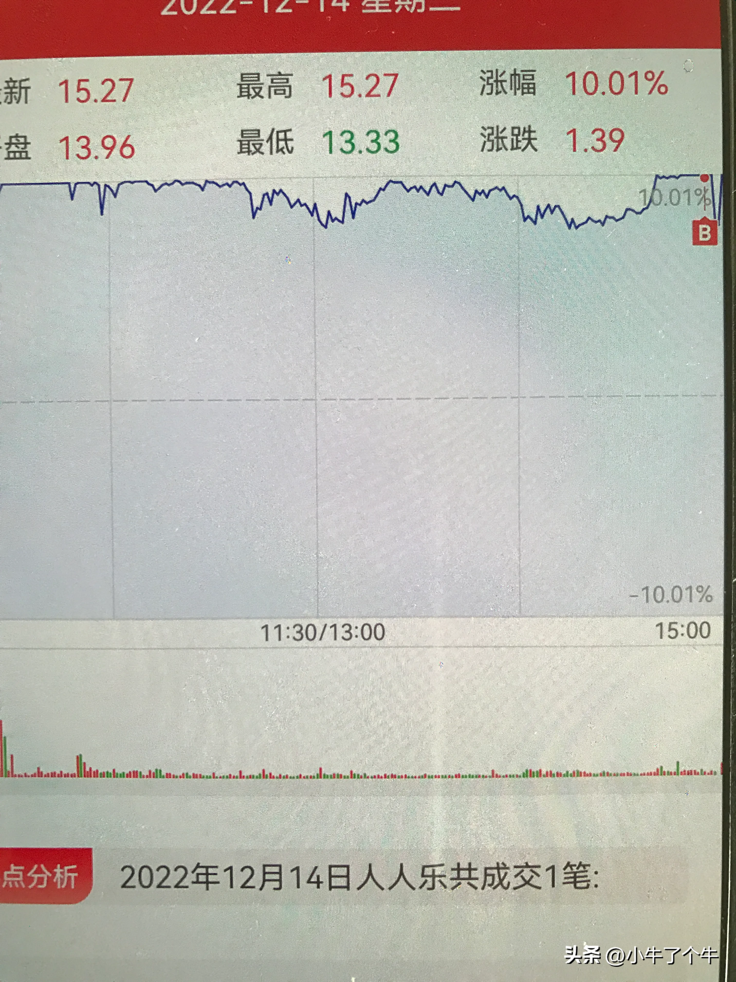 人人乐,周三尾盘涨停介入的,周四尾盘竞价走的,说实话,这个有点后知后觉,前几天不敢上,周三下午我想等它到14.9以下再进的,但是就是不下,后面拉起来了,我看到涨停封死就去排了。
